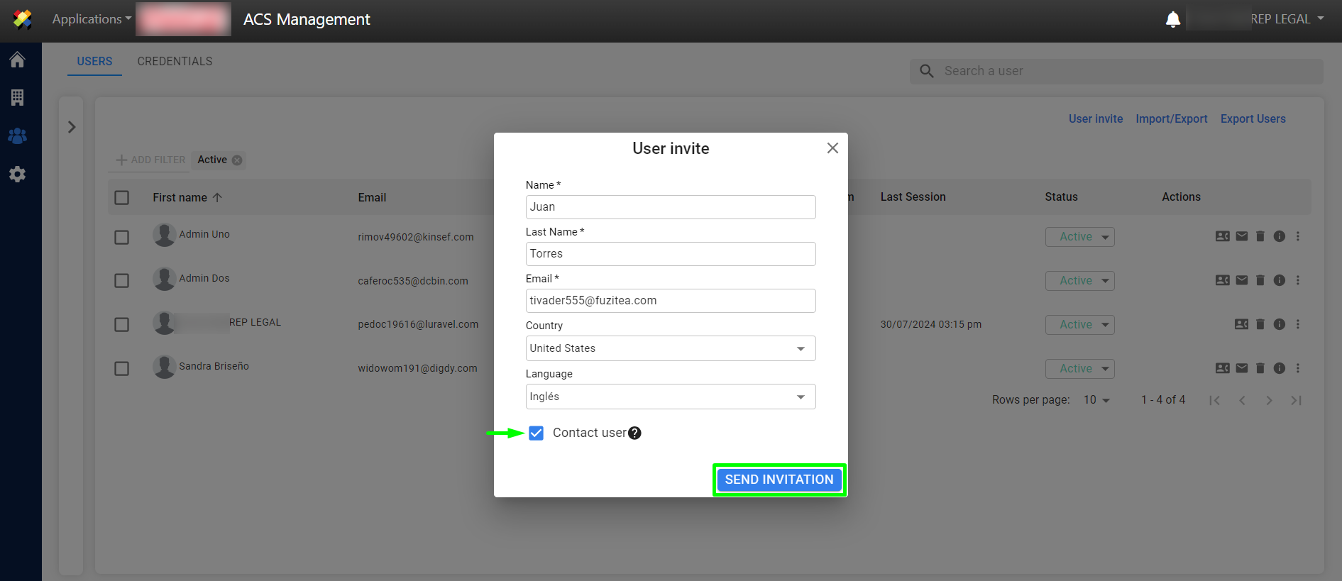 3. Fill in the fields and check the checkbox to make it a “Contact User,” then click the “SEND INVITATION” button.
