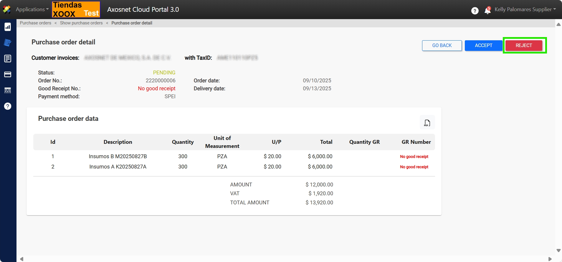 5. When you enter the details of the Purchase Order, the option to Accept or Reject the Purchase Order will appear. In this case, click on REJECT.