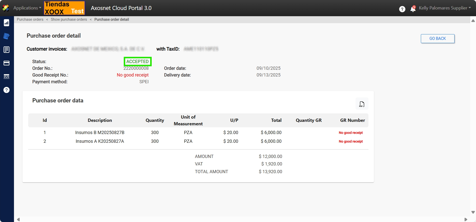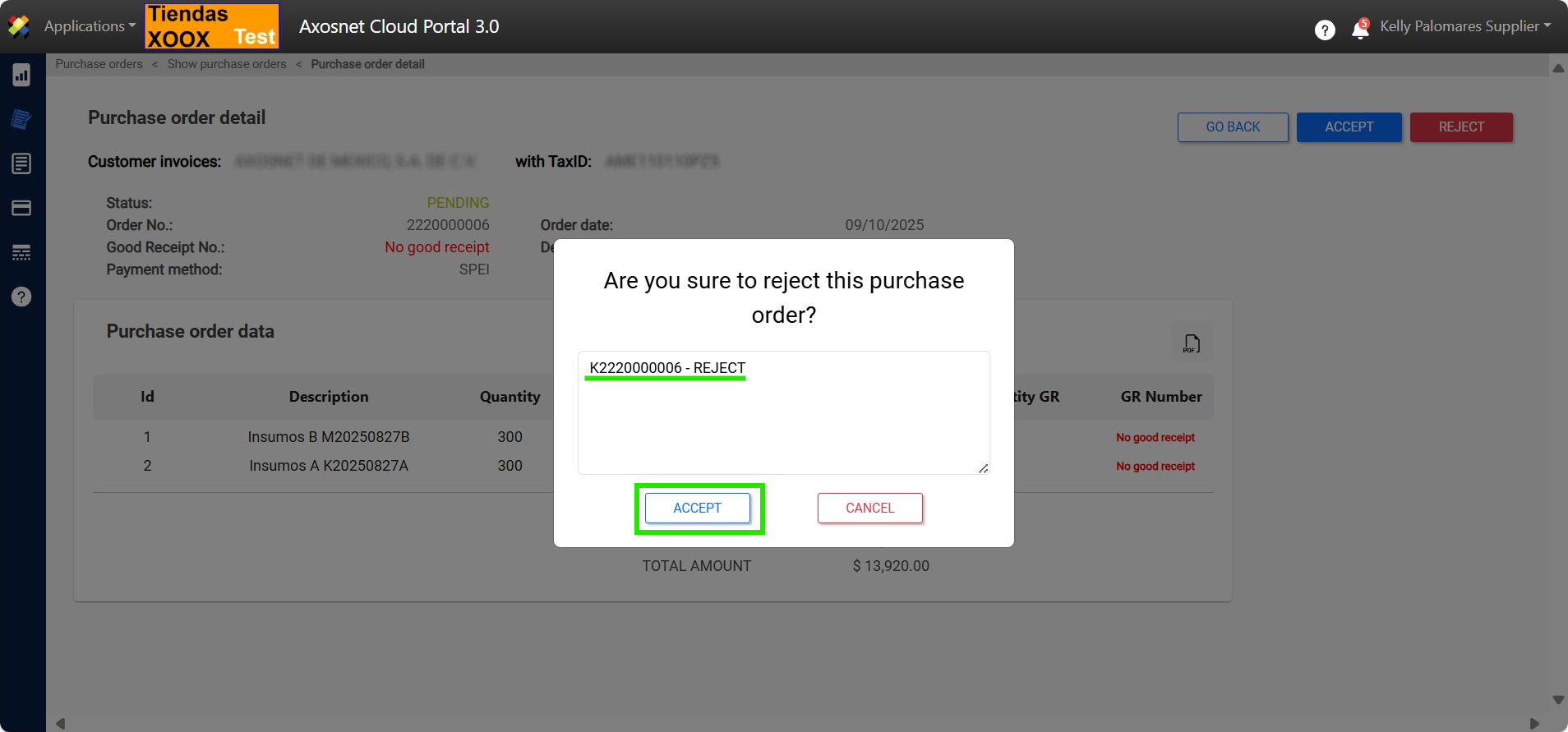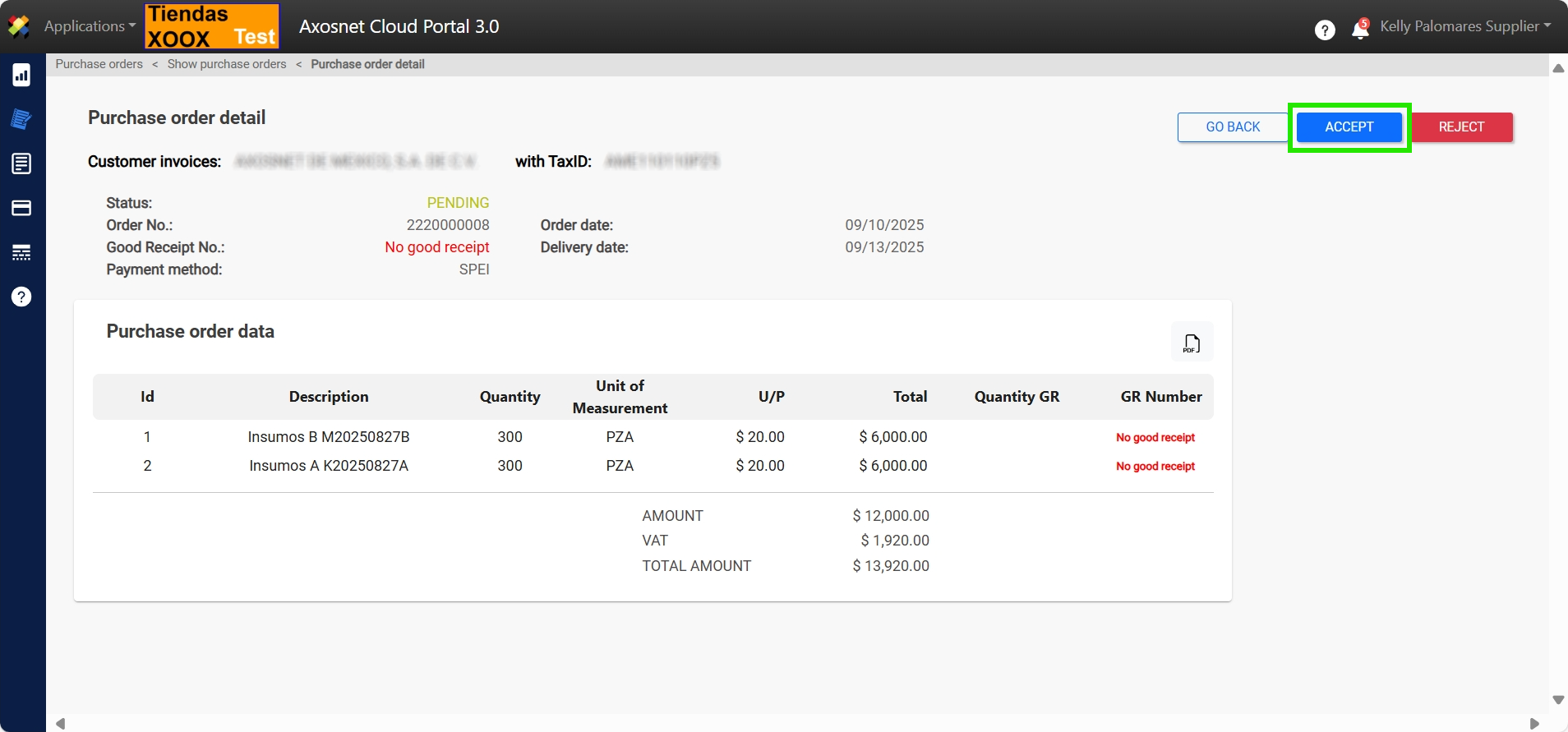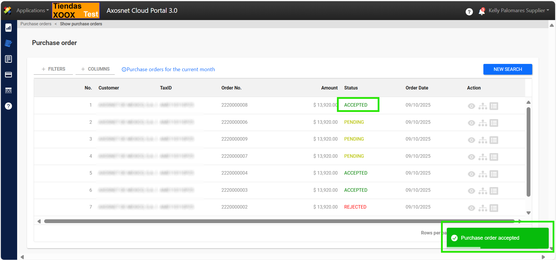 7. When ACCEPTING the purchase order, a notification message will appear and the status of the order will change to ACCEPTED.