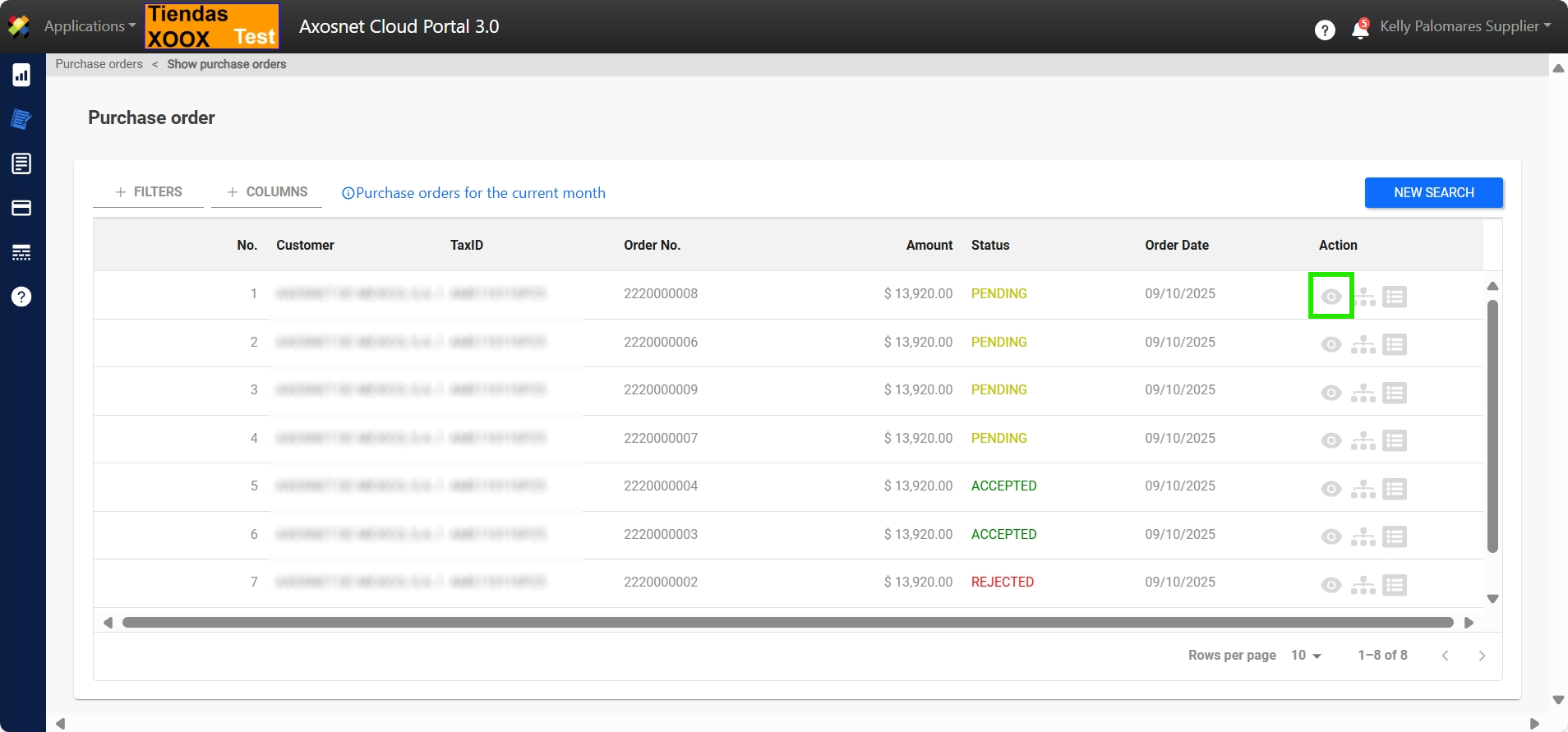4. A screen will appear with a list of purchase orders, enter the details of the purchase order you want to accept by clicking on the eye icon marked in the image.