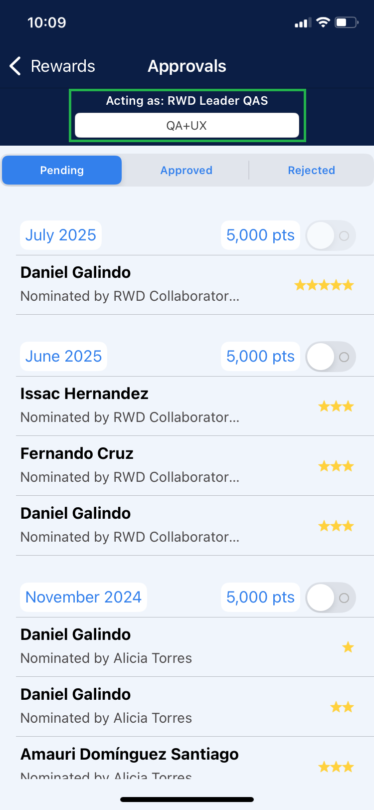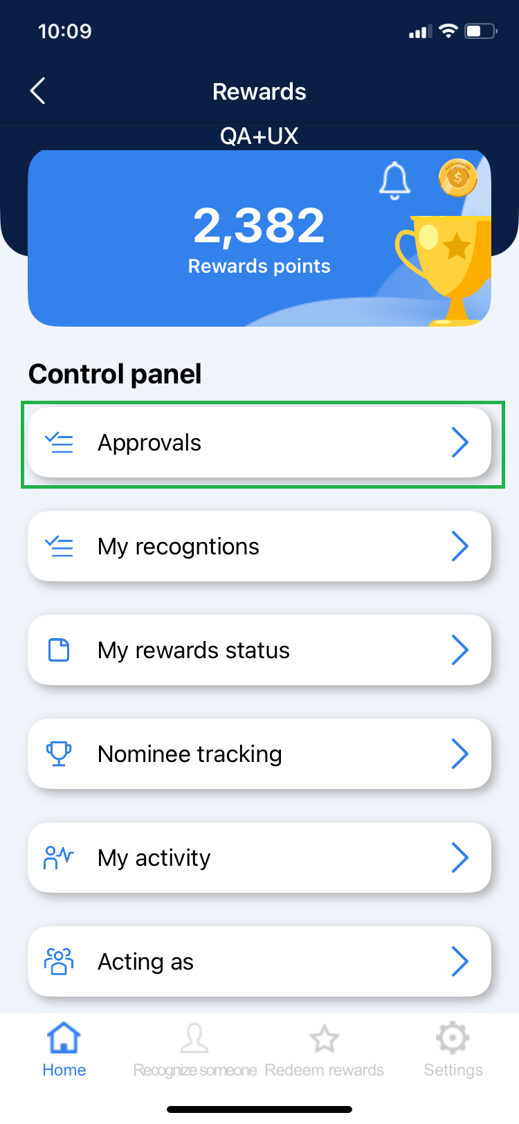 6. Click on “Approvals” and it will show you at the top the text “Acting as” and the team in which you are acting as leader.
