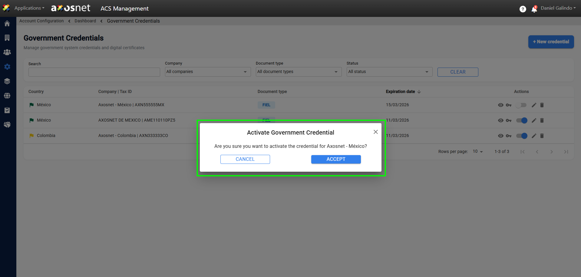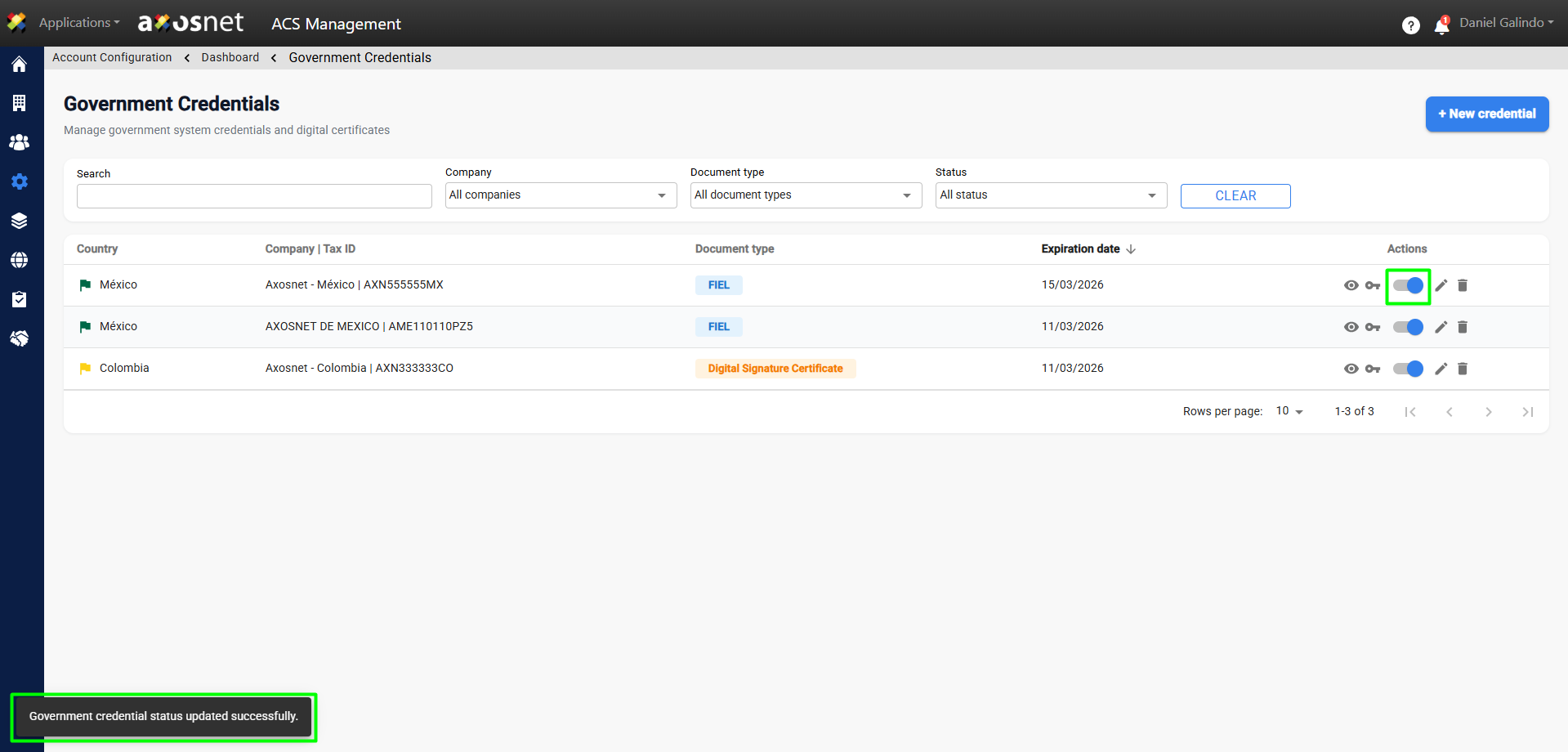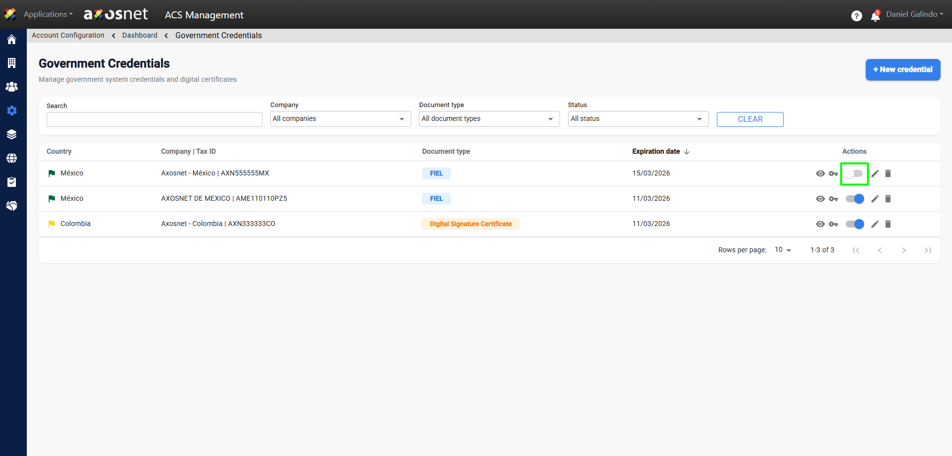 5. Identify the credential to activate and click the switch button to activate it.