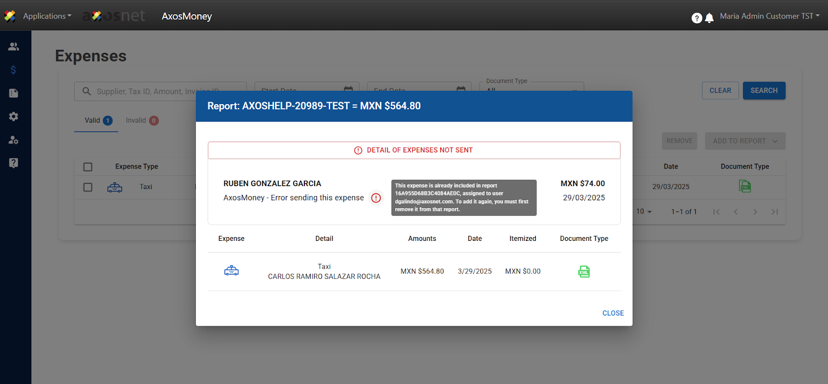 Note: If the expense is already part of another user’s report, the following message will appear.