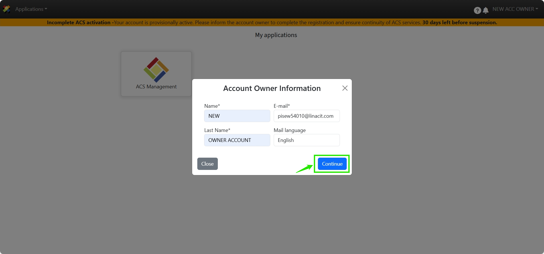 2. Register the corresponding Account Owner information and click Continue.