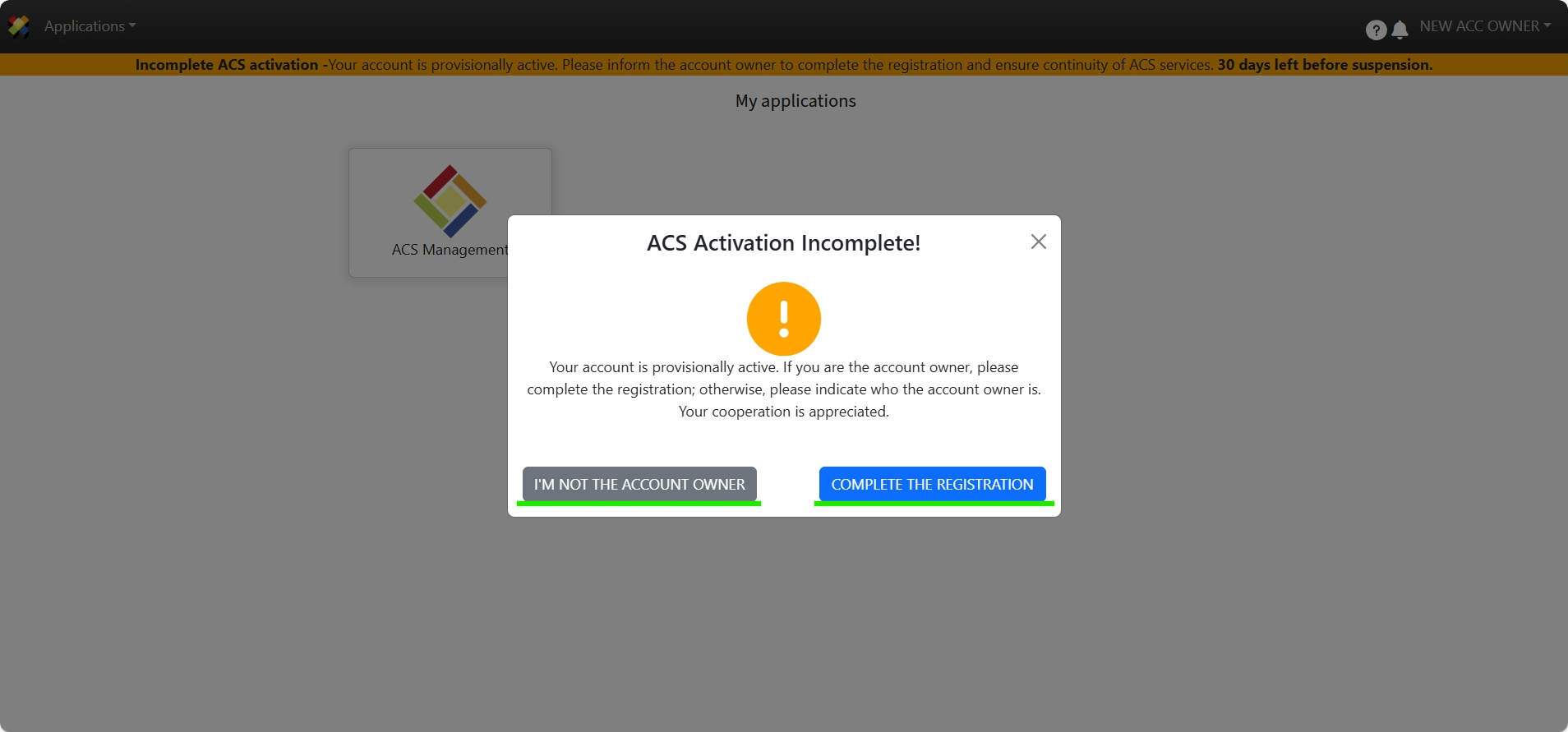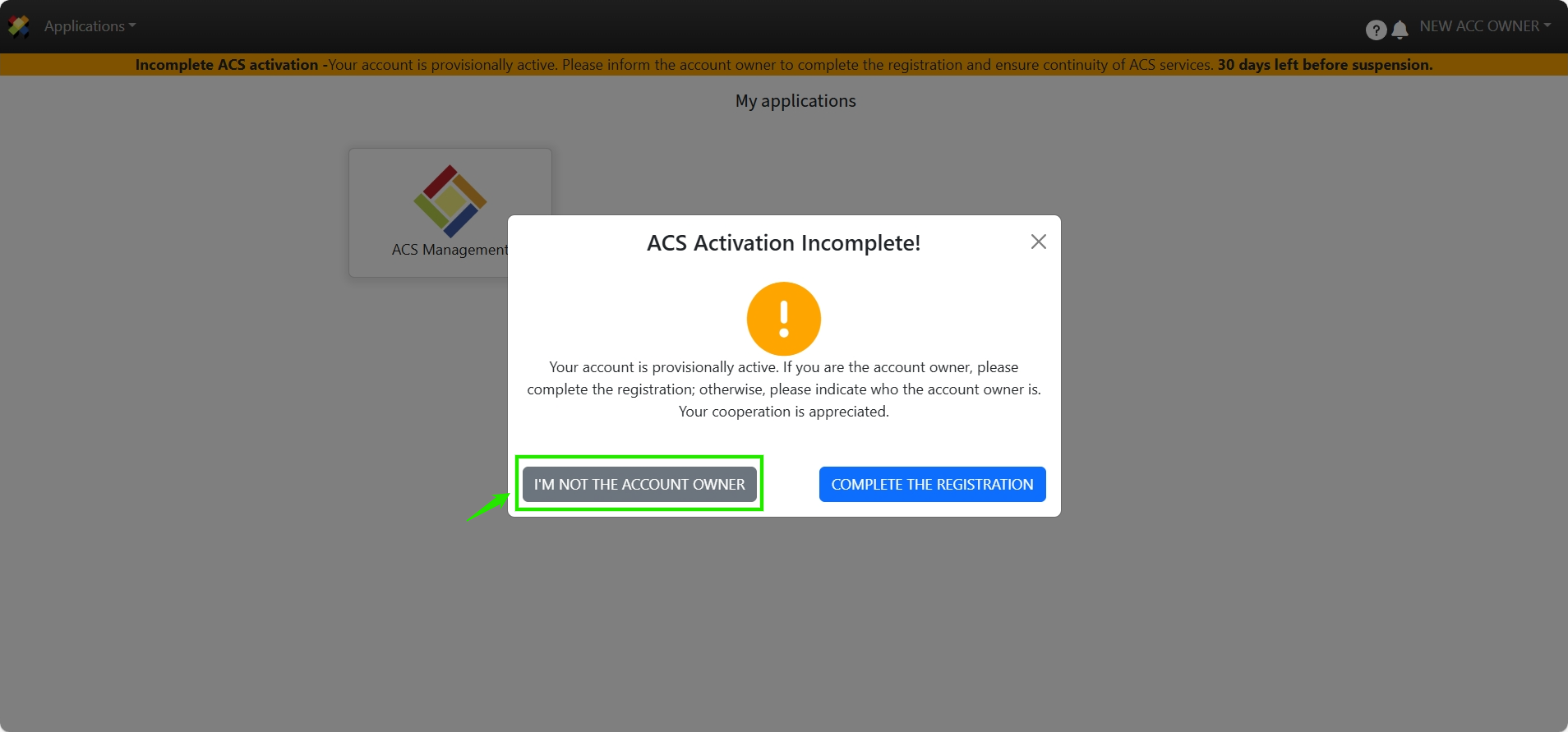 When the user registered as the Account Owner logs in to ACS Management, the page will prompt the selection of one of the 2 options as appropriate: “I am not the Account Owner” and “Complete Registration”.