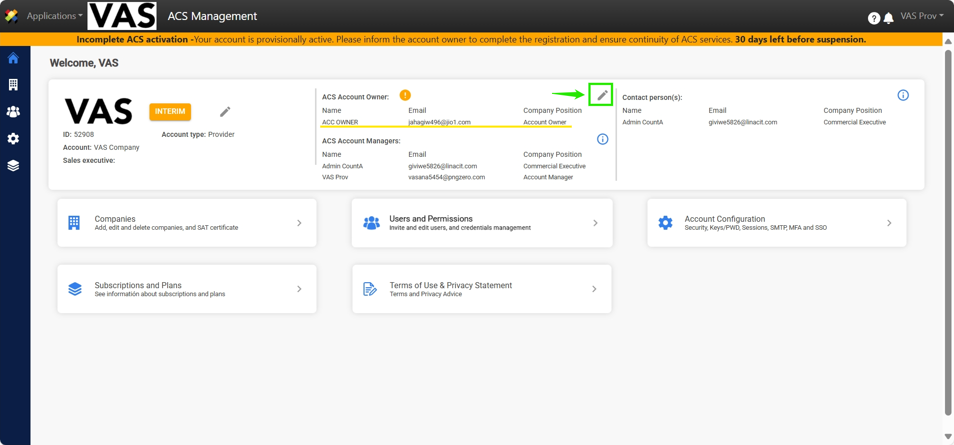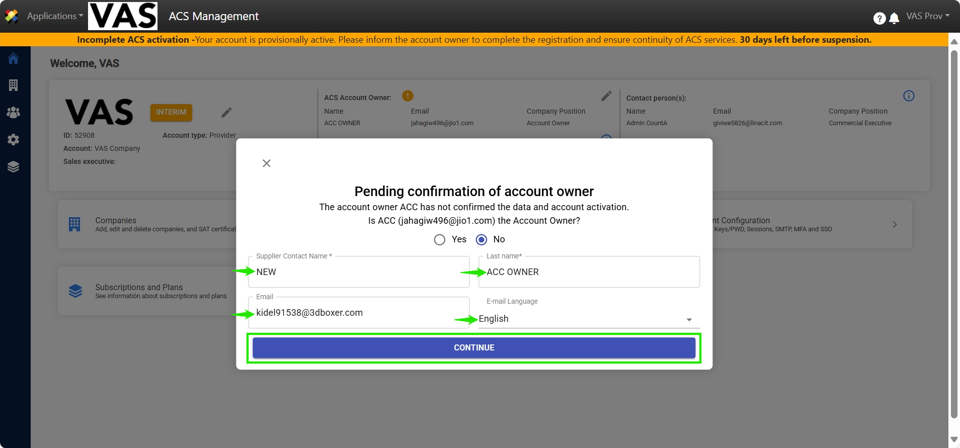 When the proposed Account Owner has not confirmed the account activation in ACS Management, there will be an option to register the details of a new user to change the Account Owner. There are 2 ways to make this change, detailed as follows: