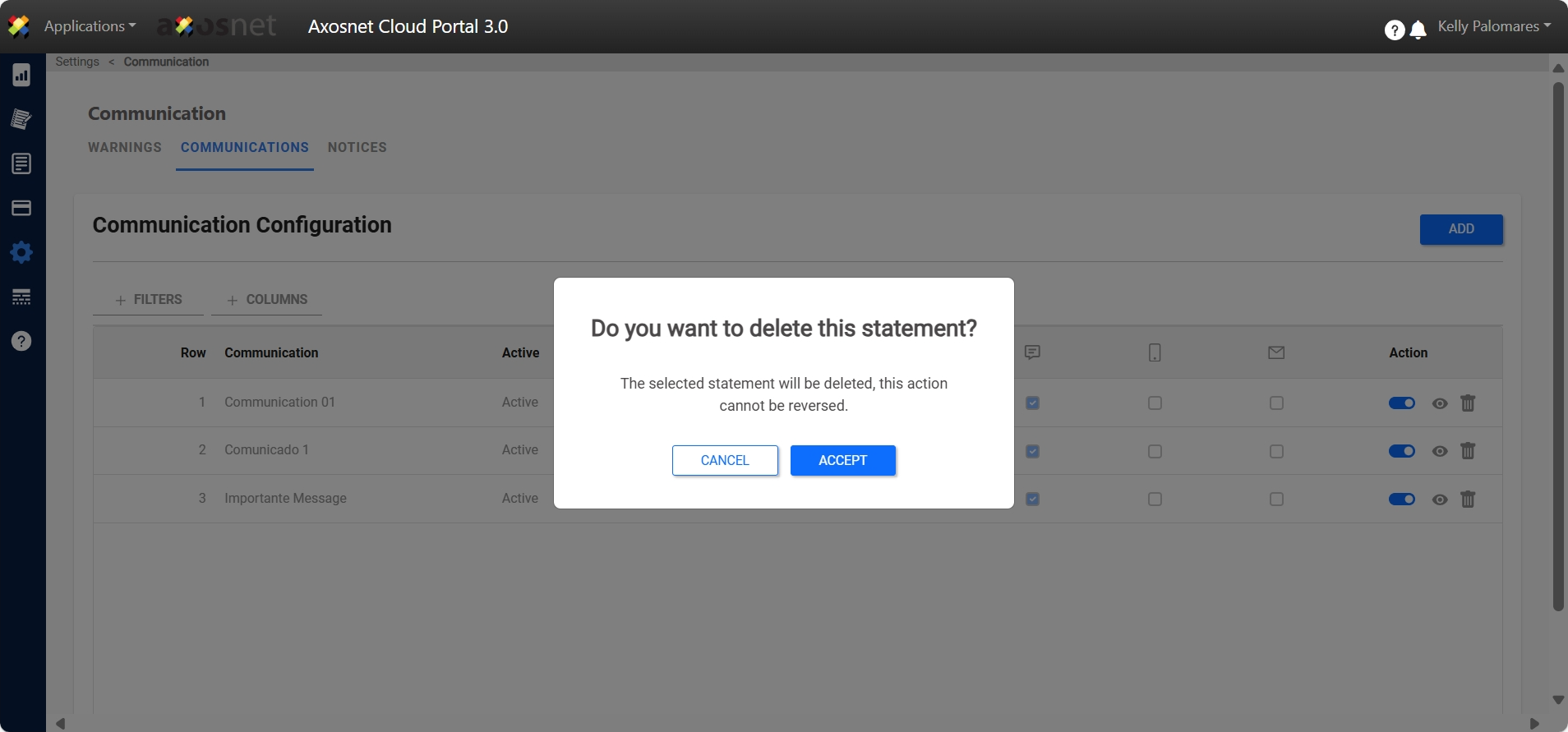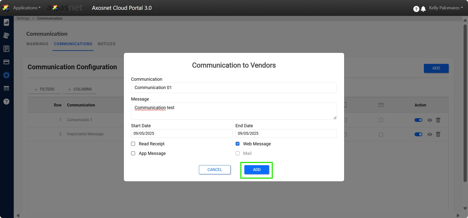 In this section you can create communications addressed to all of the Client’s Suppliers. To do this, you must click on the ADD button. Here you can add a title, a description of your communication, the dates on which this communication will be active, read confirmations and the means by which the communication will be sent to you.