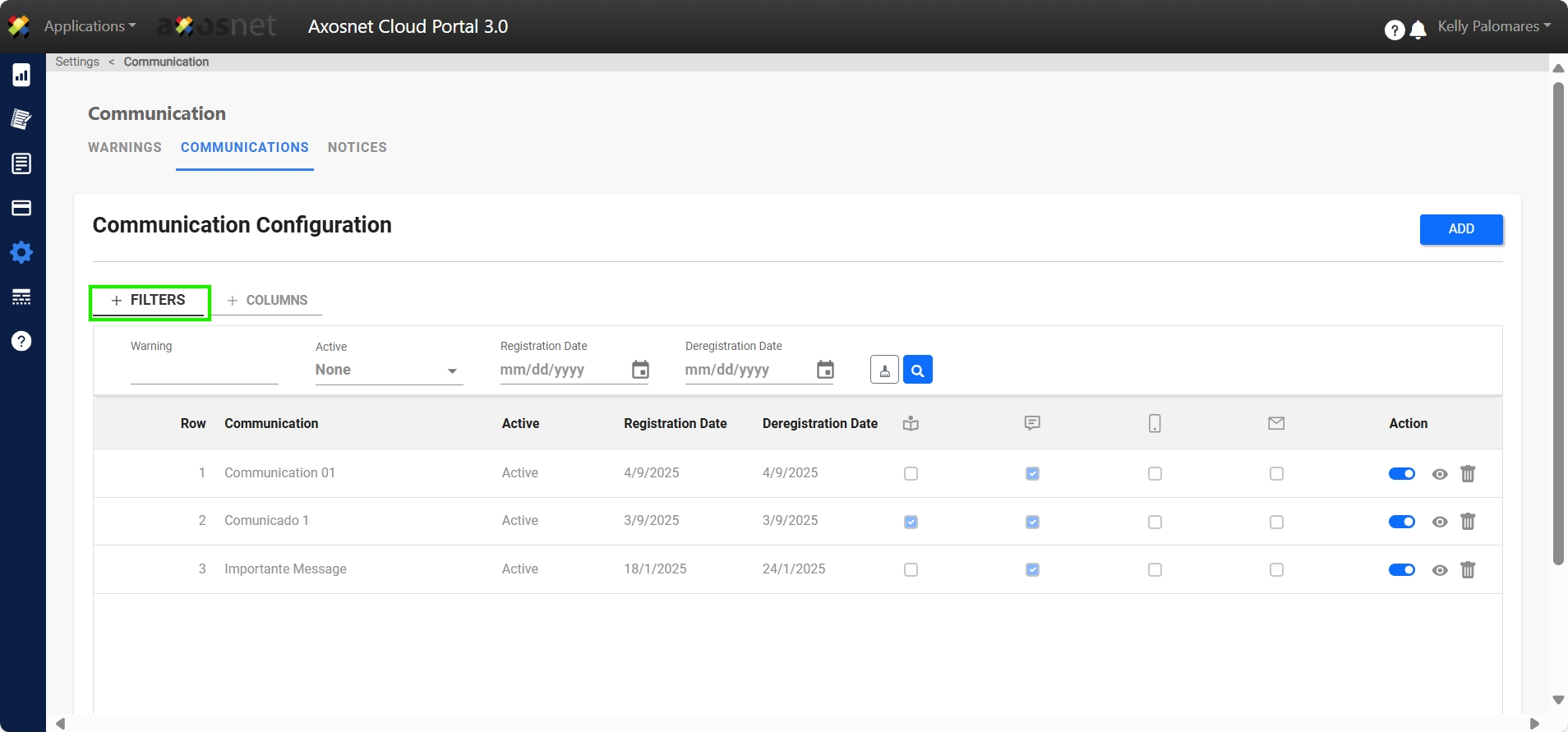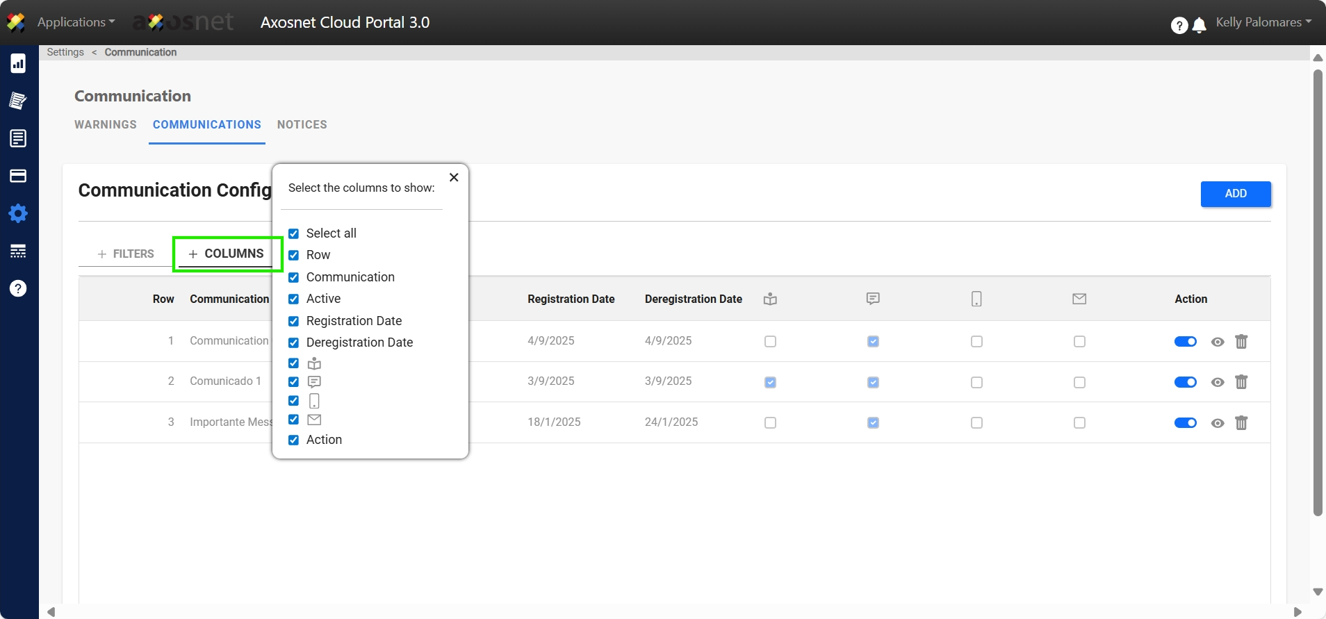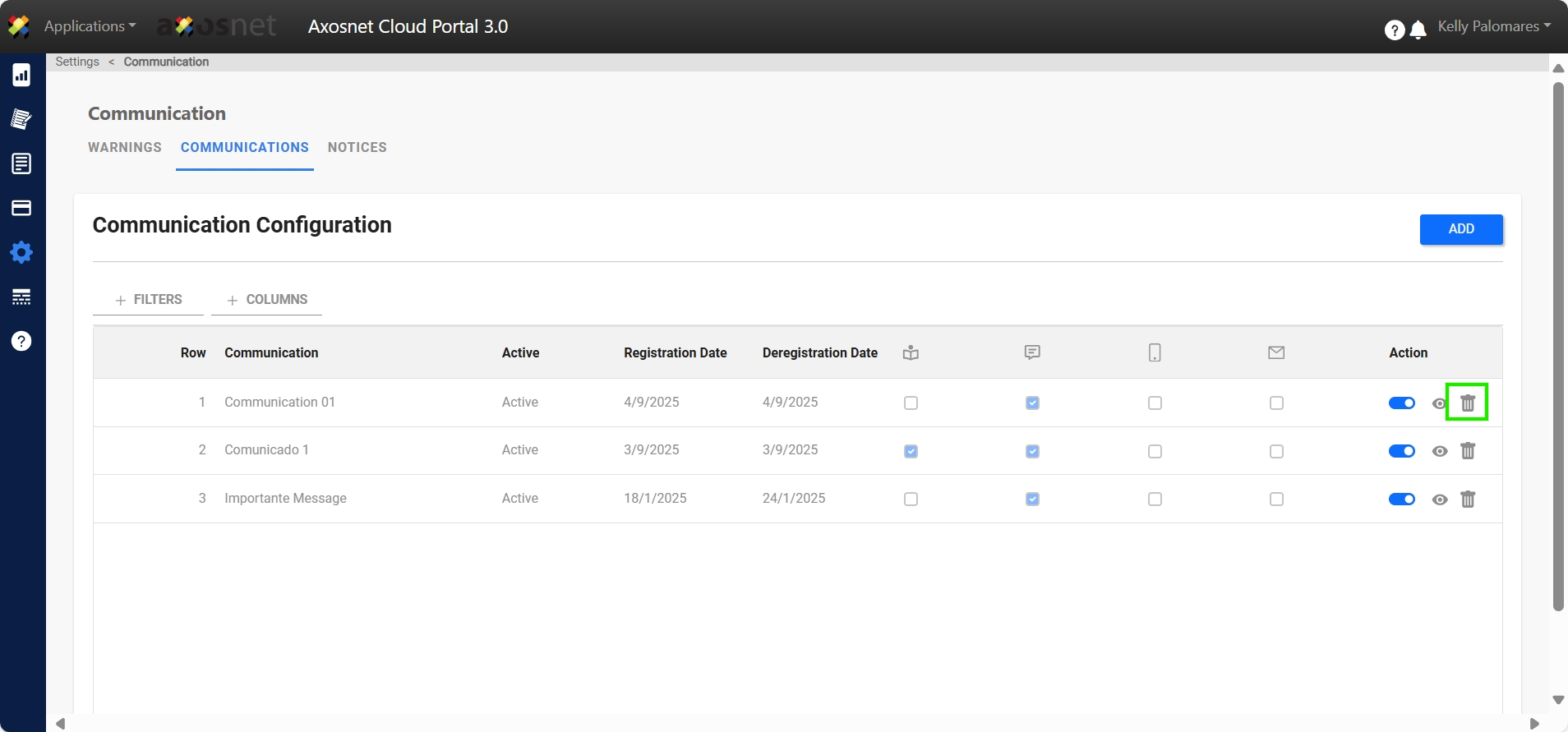 4. To add a new communication, click on ADD.