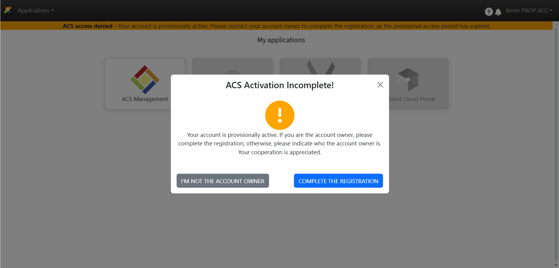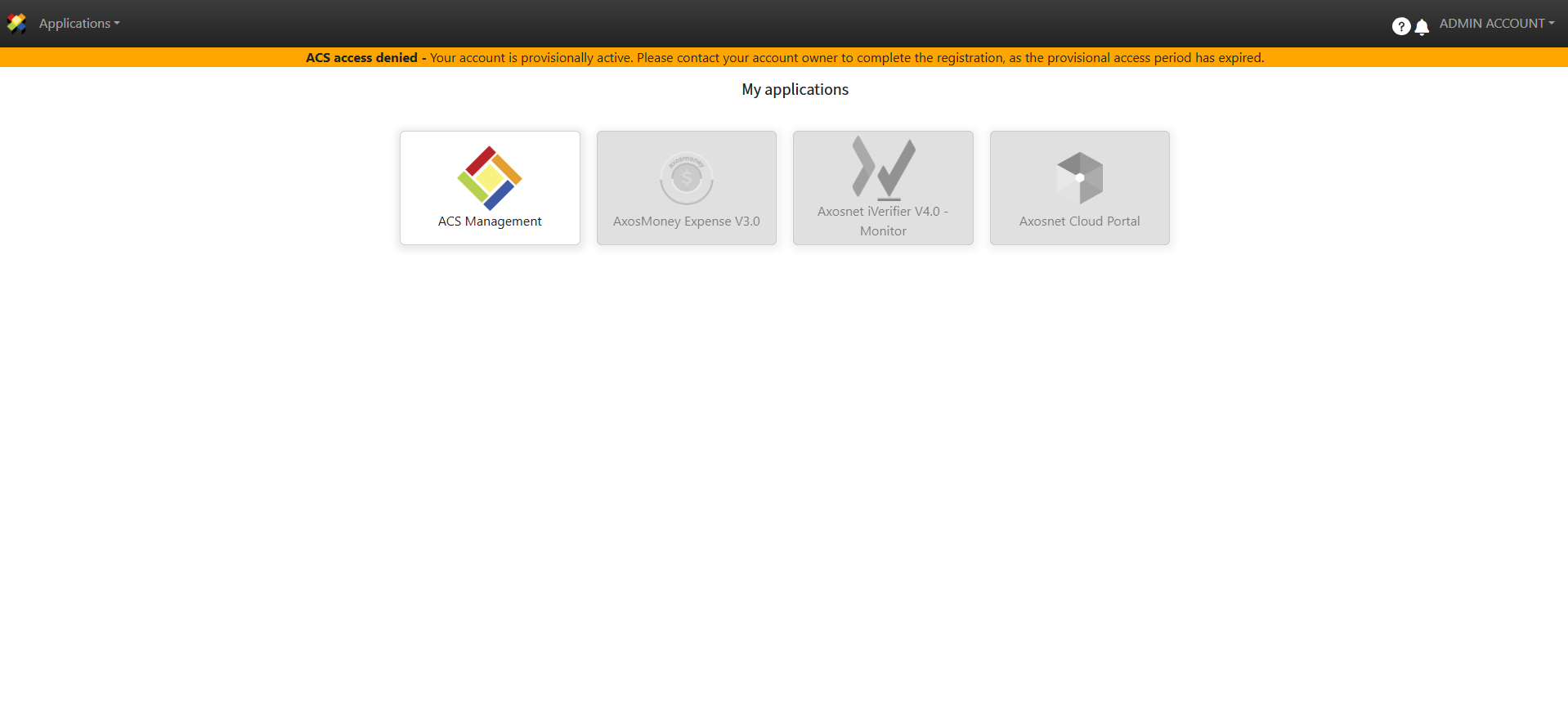 When accessing as an Account Administrator to the expired company account, the applications available are shown in gray, indicating no access to these applications. The account administrator can still access ACS even with the company account expired, solely to modify the Account Owner’s email address.