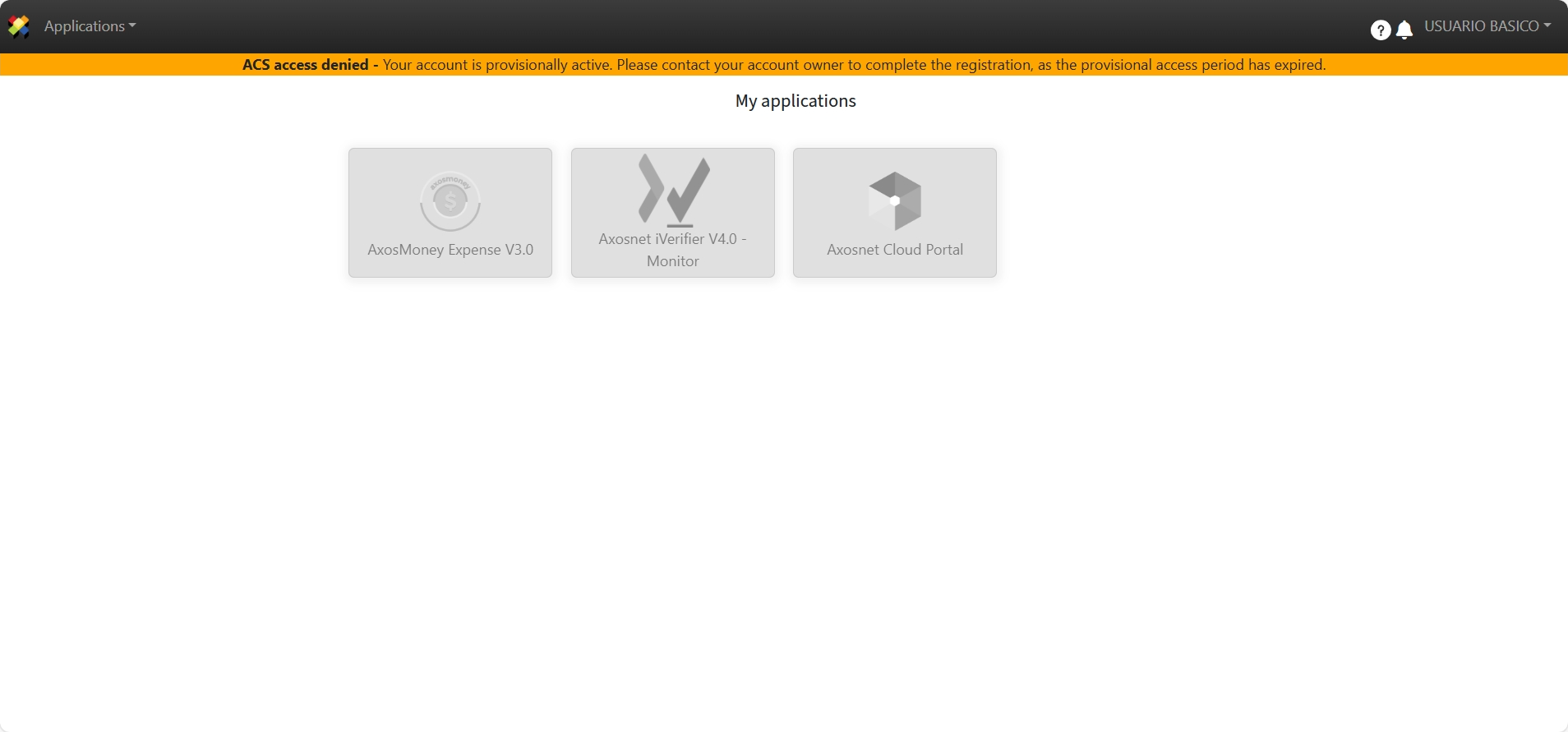 When accessing as a Basic User to the expired company account, the applications available are shown in gray, indicating no access to these applications.