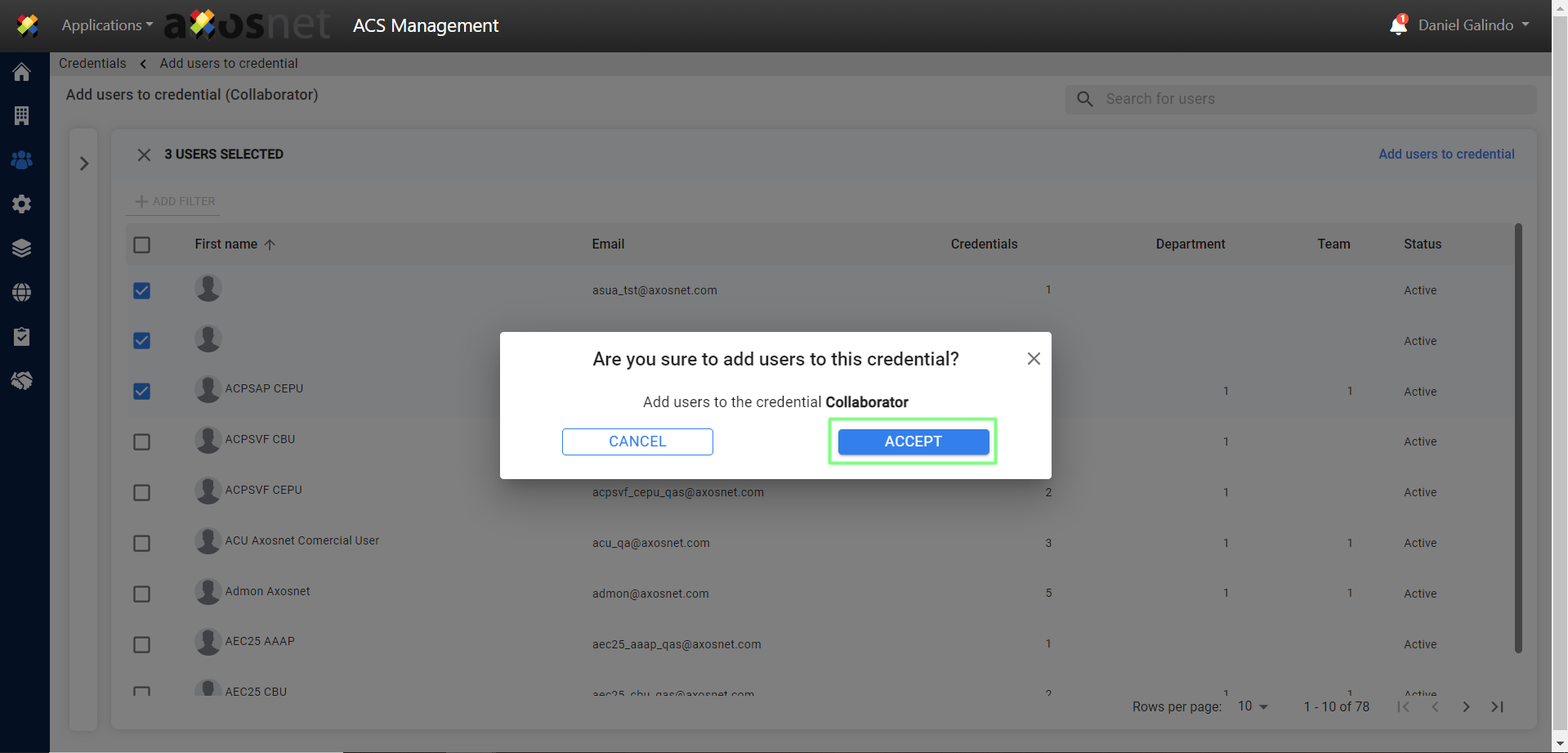 8. A pop-up window will appear to confirm the users we are adding to the credential. Click “Accept”.