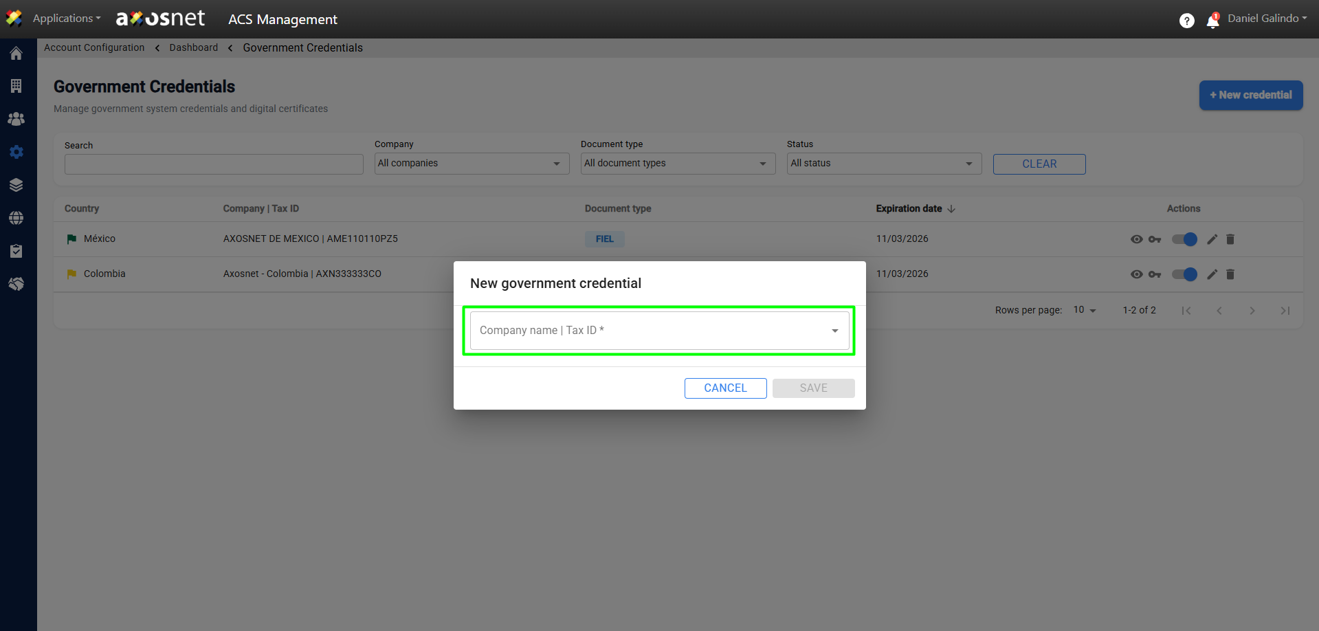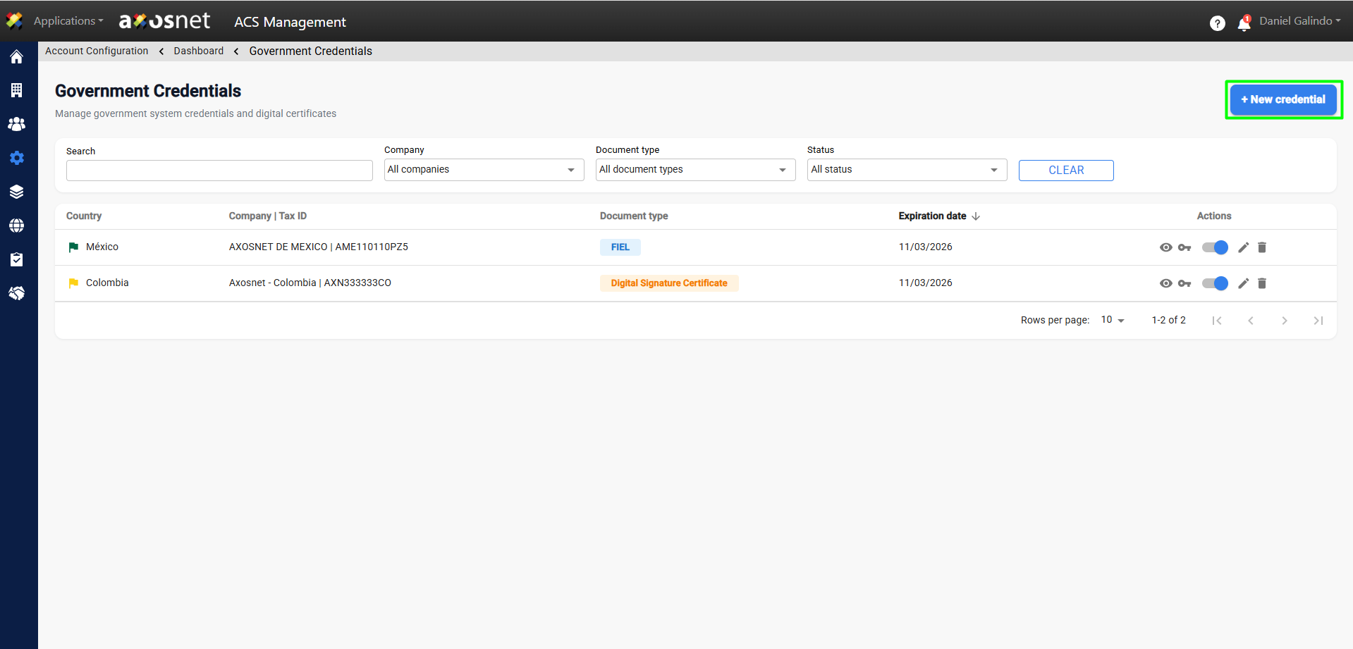 Note: Depending on the country of origin of the company, the information requested to create the credential may vary.
