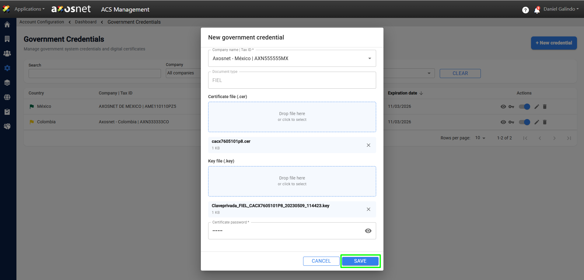 7. Provide the information and documents required to create the credential. When finished, click save.