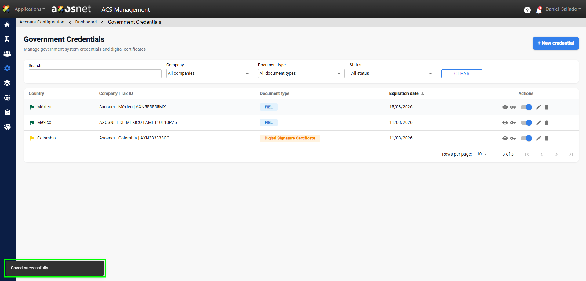 8. A confirmation message will appear and the new credential will appear in the Government Credentials list.
