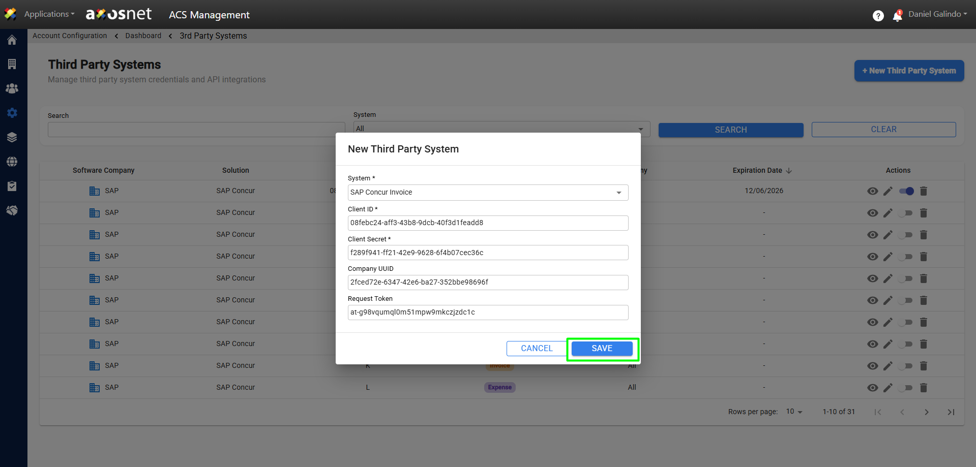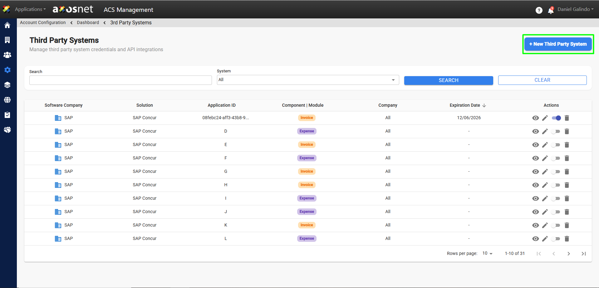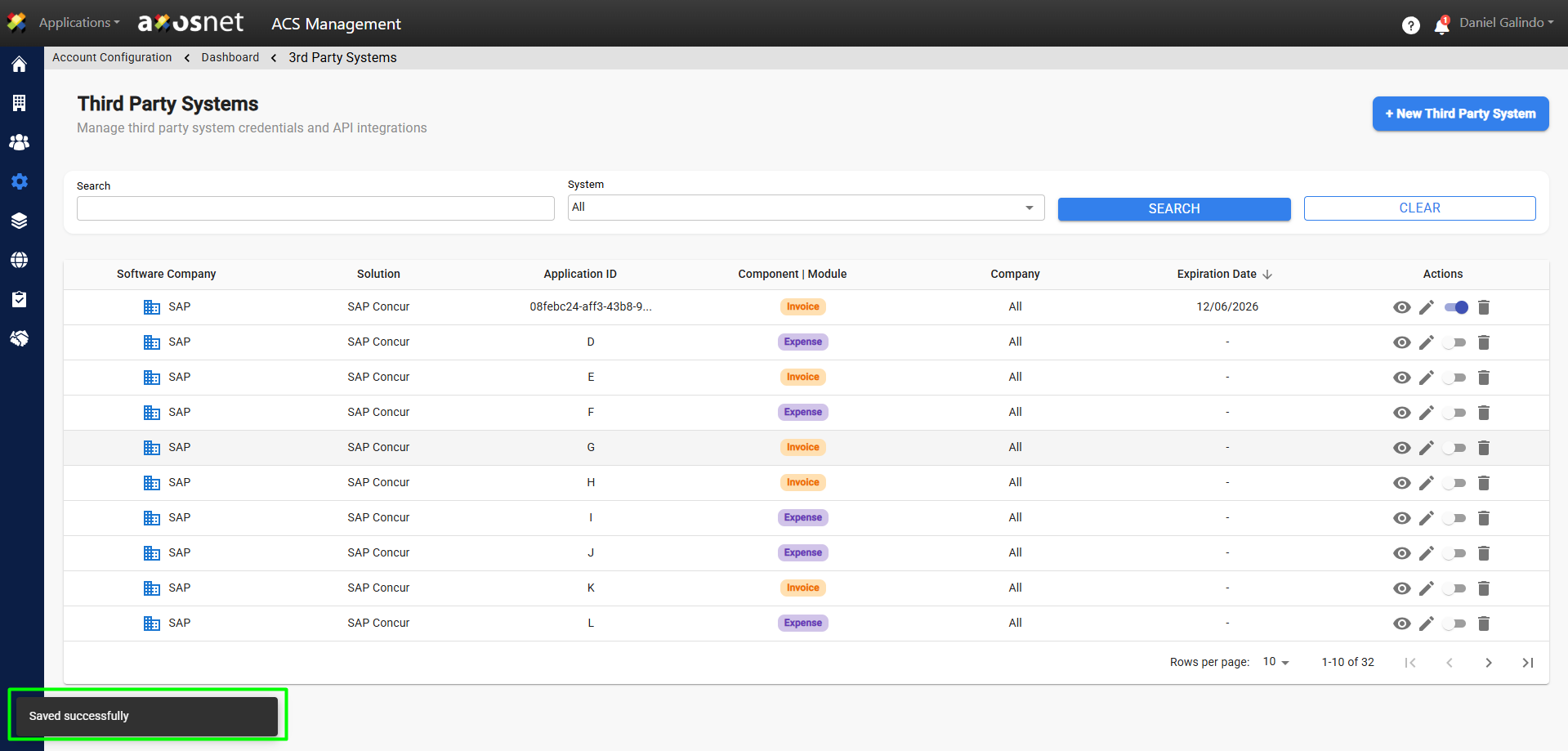 7. A confirmation message will appear and the new system will appear in the Third-Party Systems list.