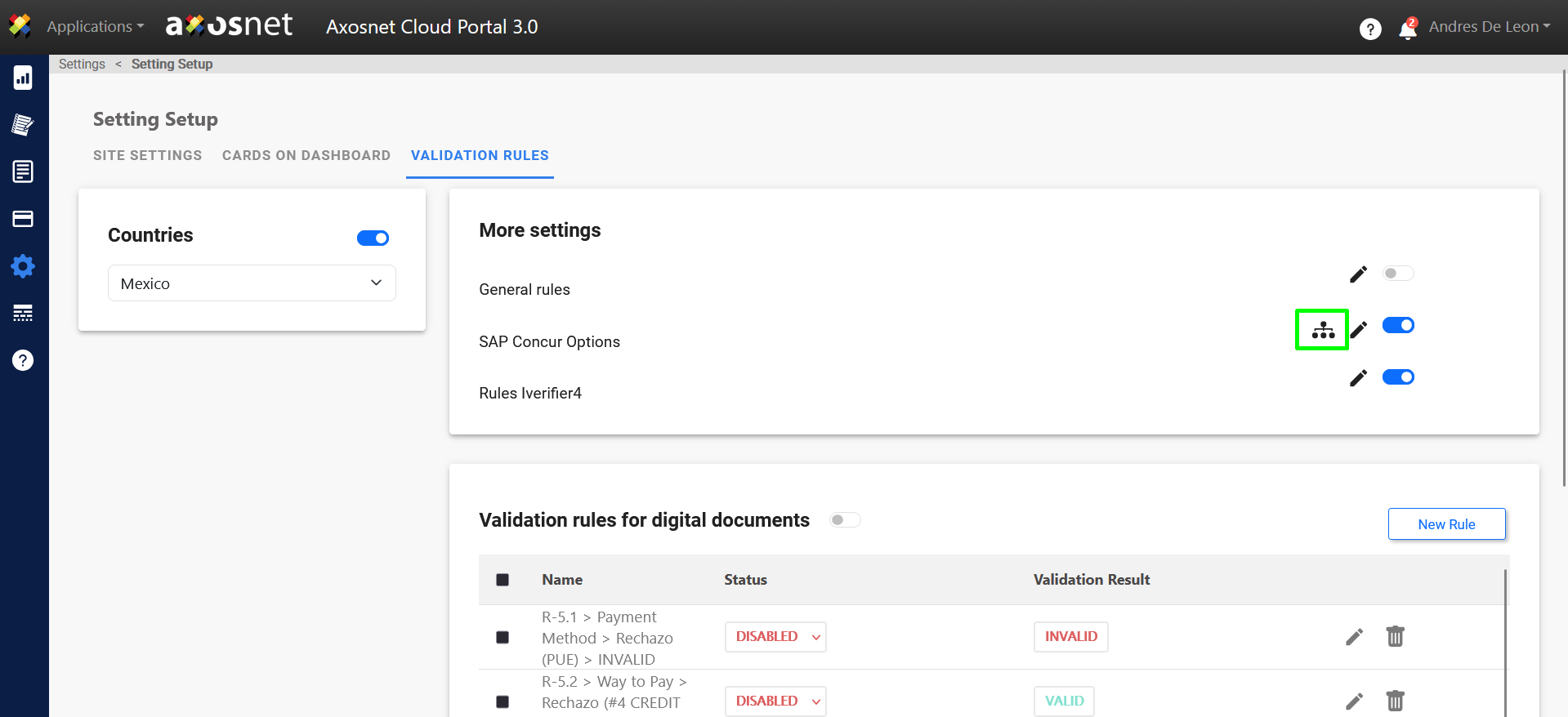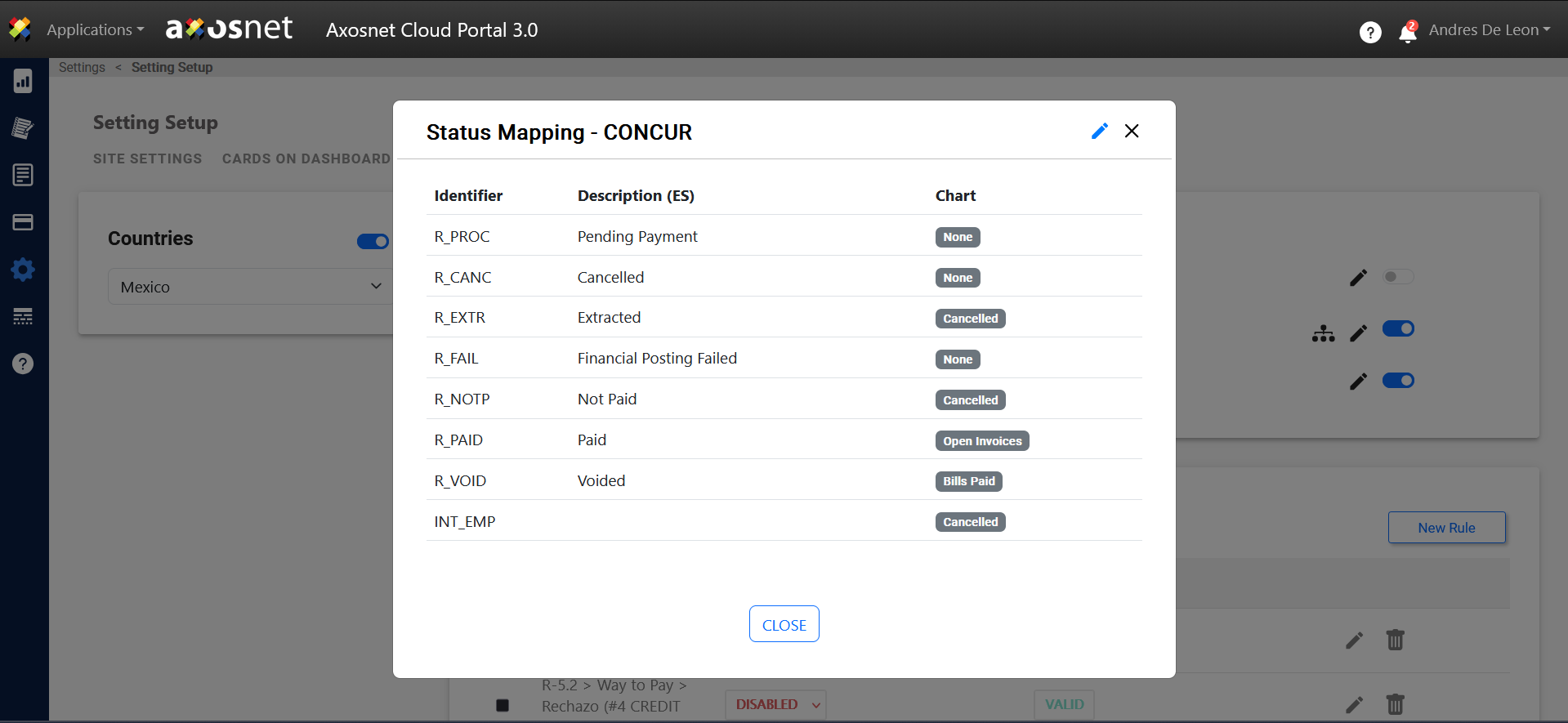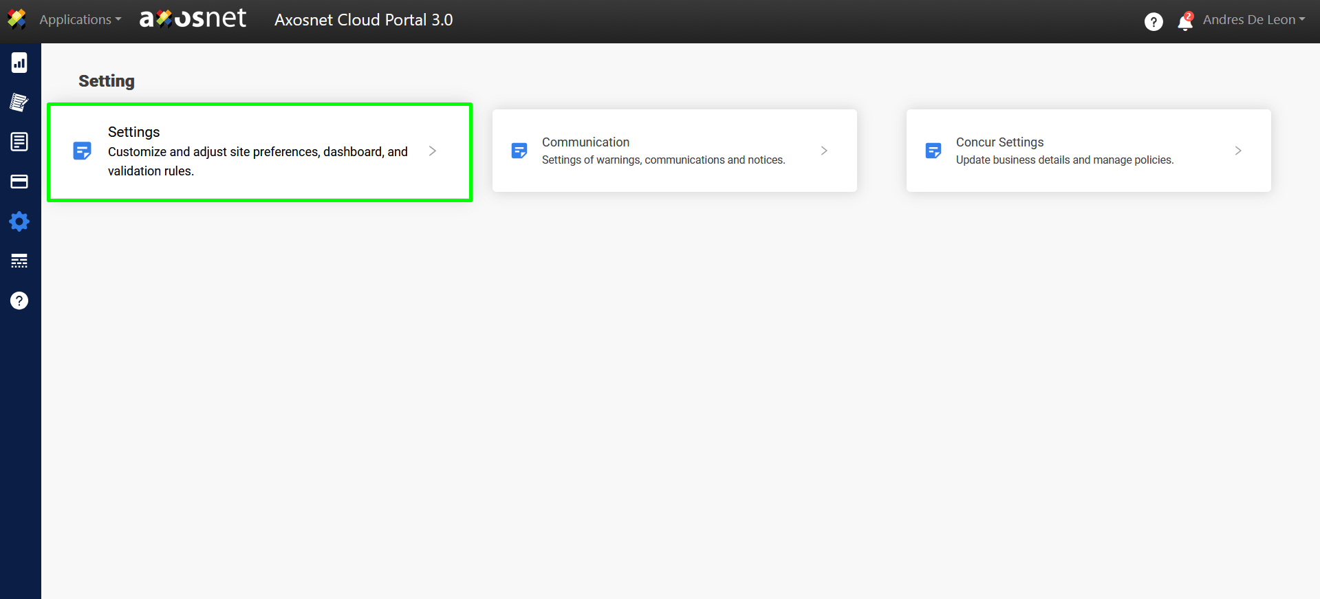 With the SAP Concur integration, you will be able to view invoices and their statuses on the Axosnet Cloud Portal Dashboard. Upon entering the configuration, you will be able to see the integration with Concur.