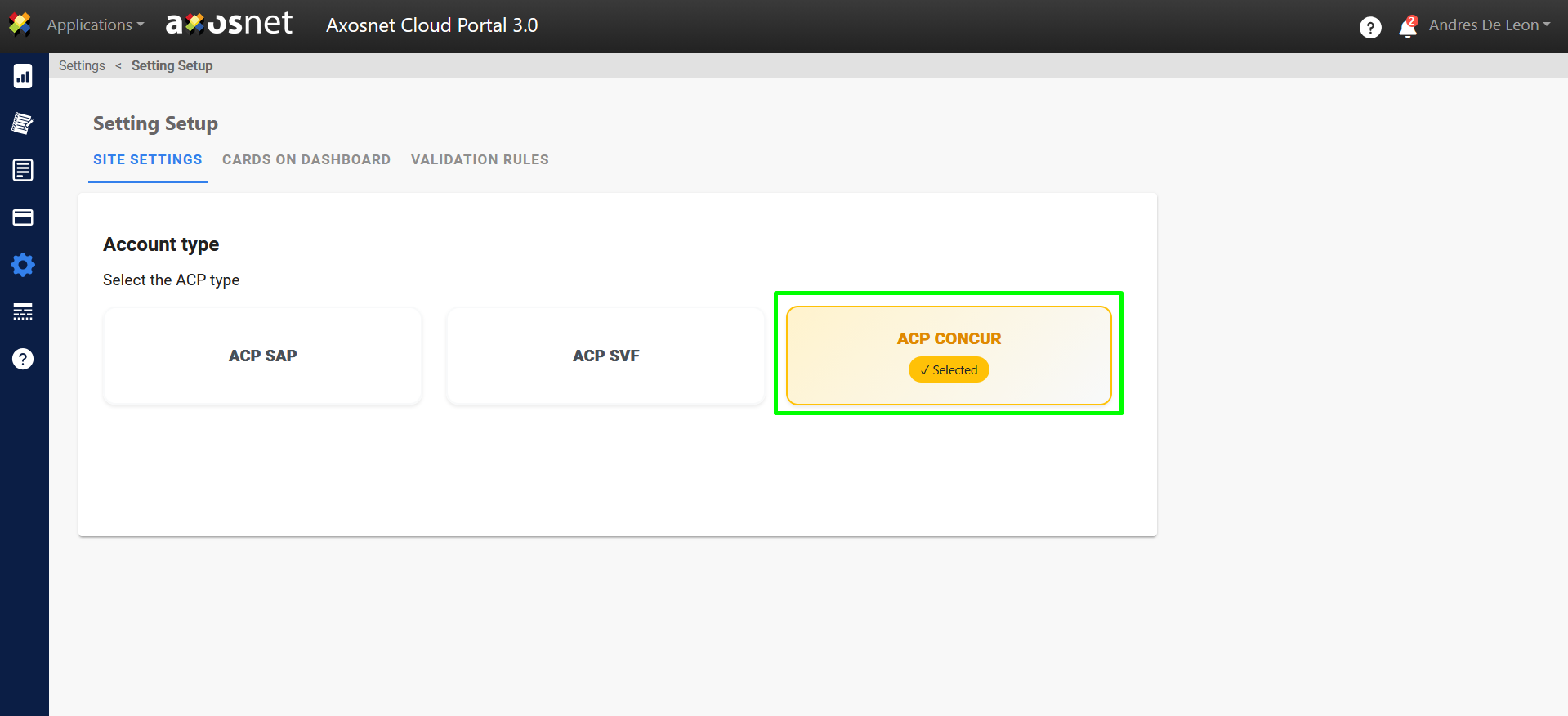3. On the Site Settings tab, make sure you have the ACP Concur option selected.