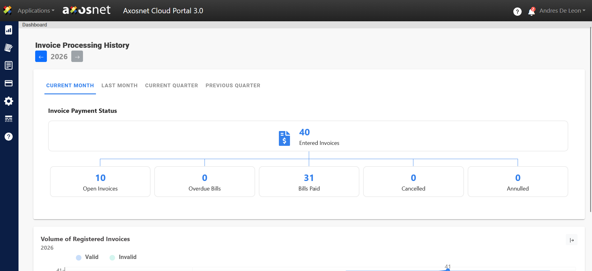 5. With the selected ACP Concur configuration, SAP Concur invoices will be displayed on the Axosnet Cloud Portal dashboard with their respective statuses.