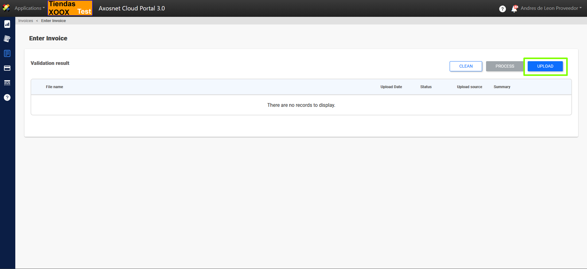5. In this subsection, you can upload documents (invoices, payment supplements, etc.) to be entered into the portal. Click the “UPLOAD” button.
