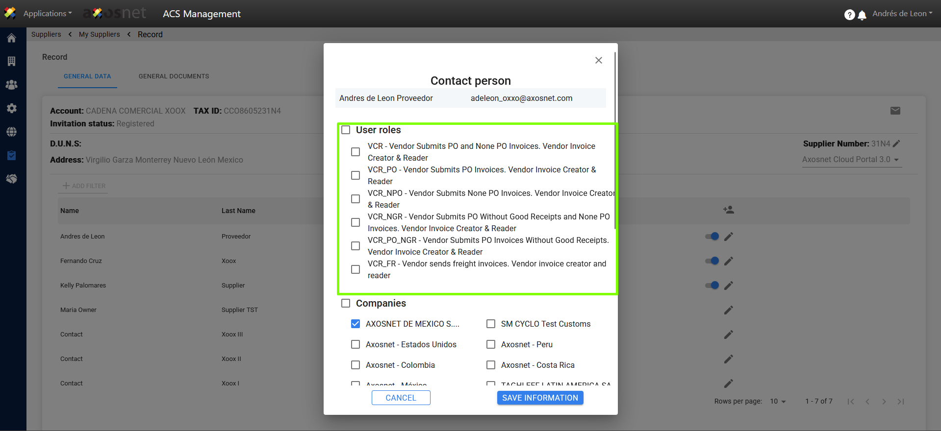 8. Select the VCR_FR option and another role that allows you to upload invoices to enable the freight functionality.
