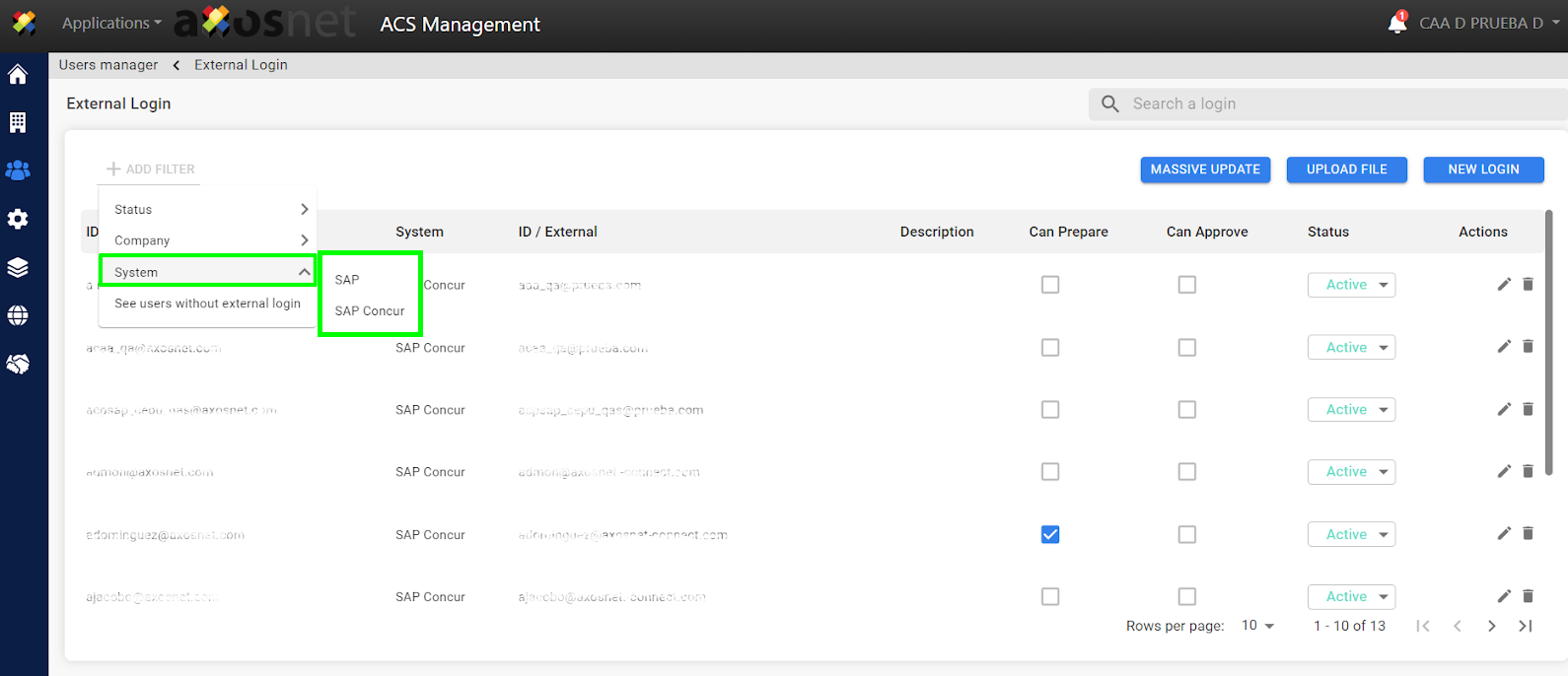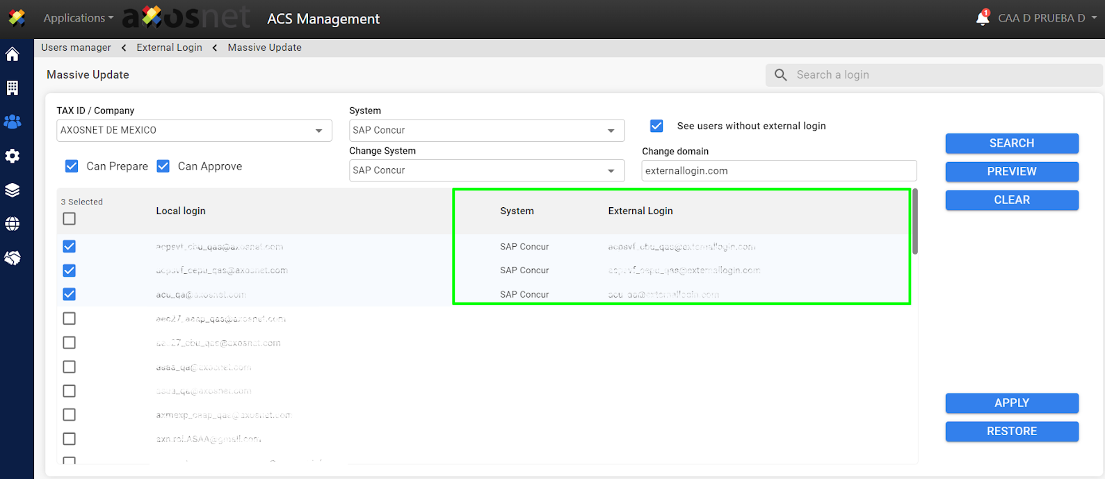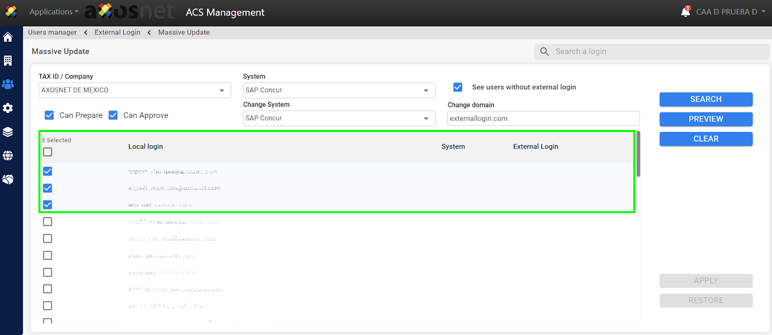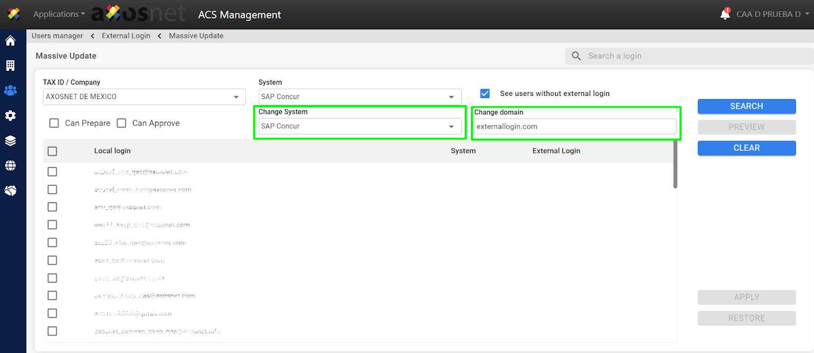 4. Select the corresponding filters (company, system, users without external login) to perform the massive update.