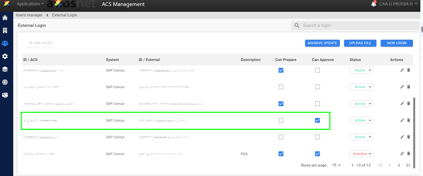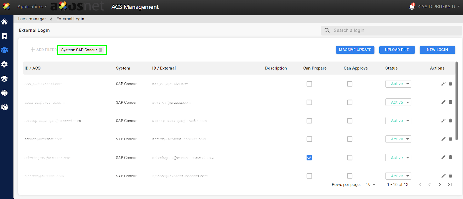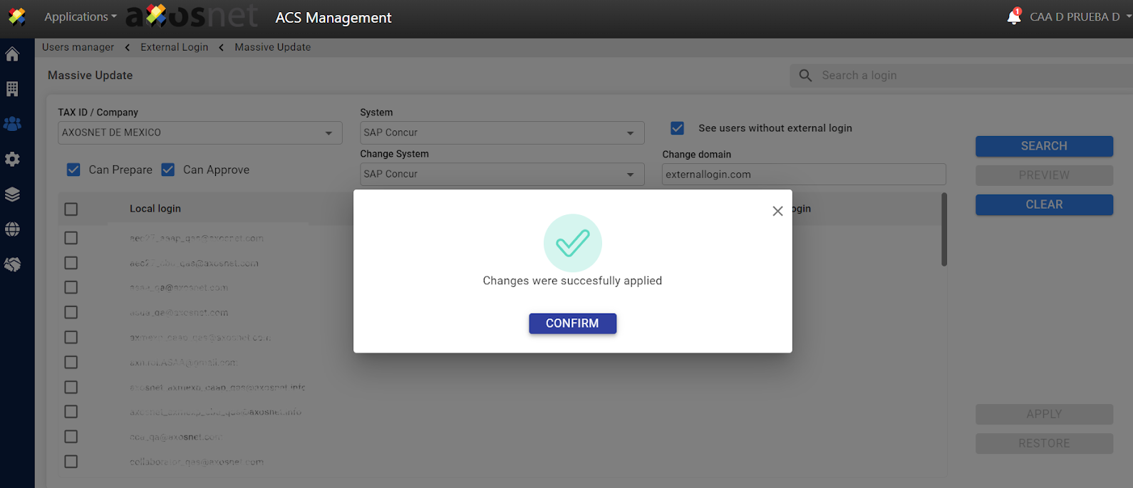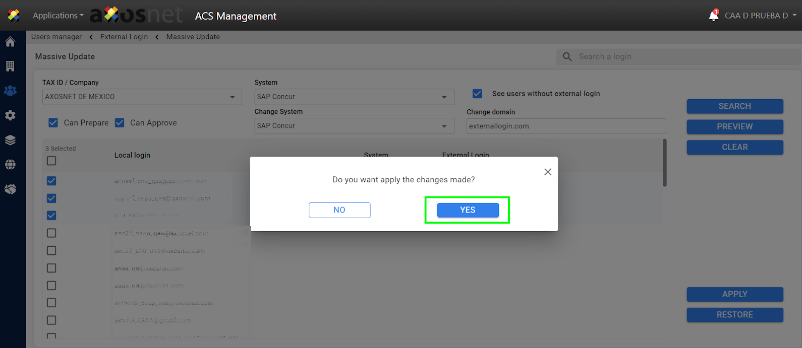 4. Select the corresponding filters (company, system, users without external login) to perform the massive update.