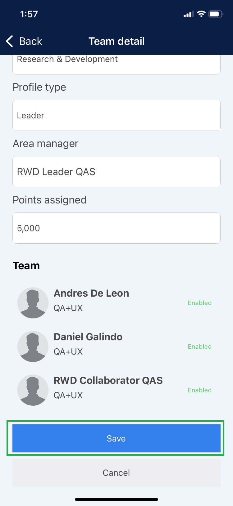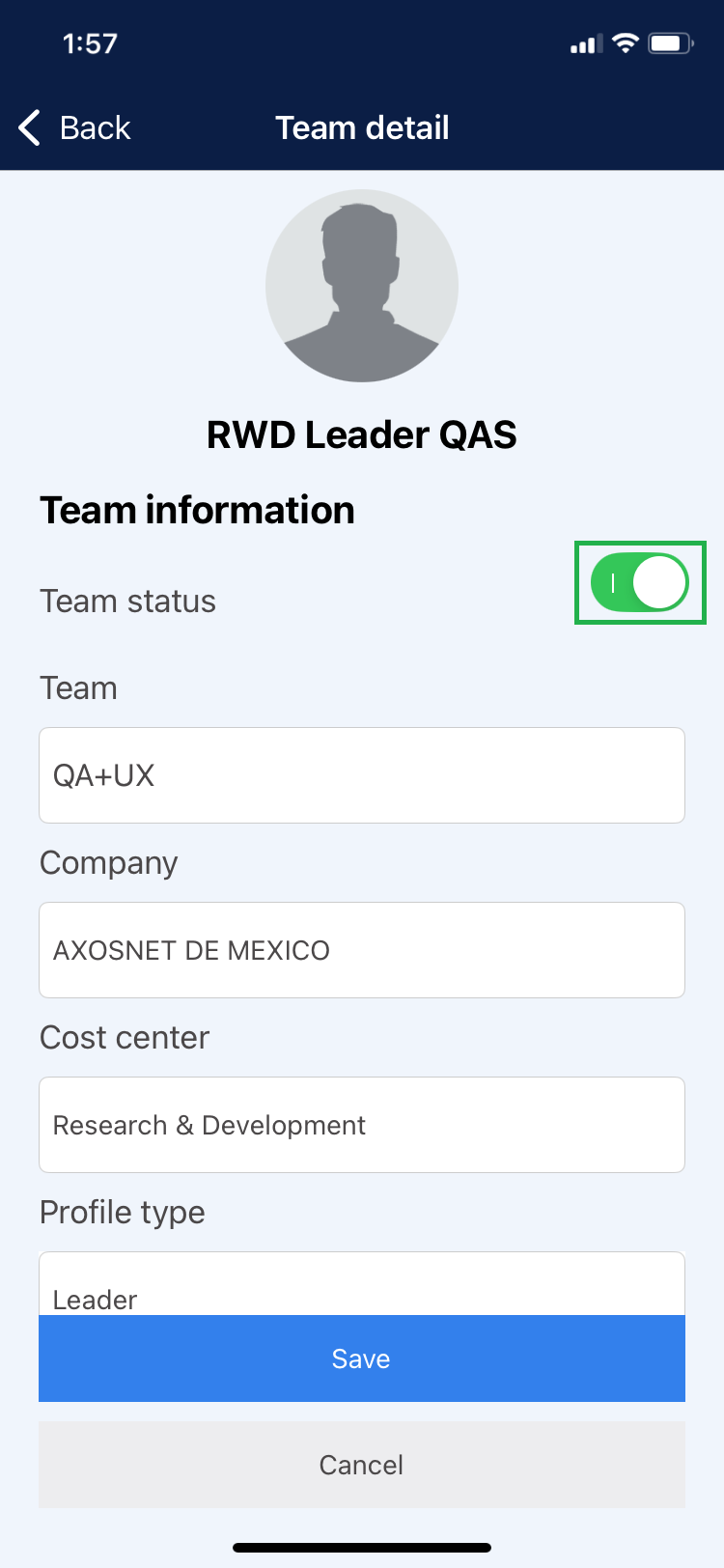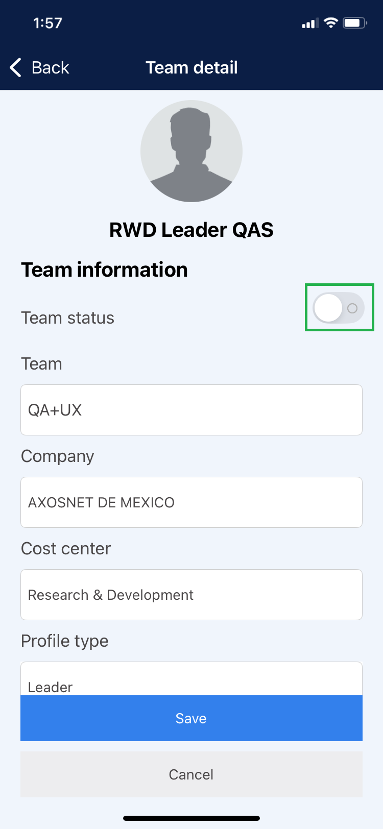 5. If you need to deactivate the team, click on the switch so it turns gray. To activate the team, leave the switch green.