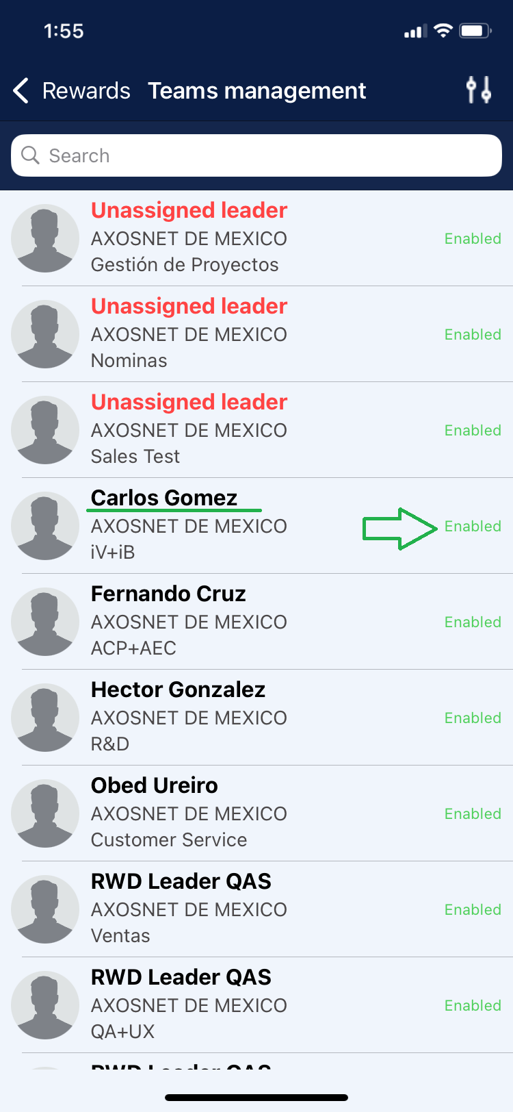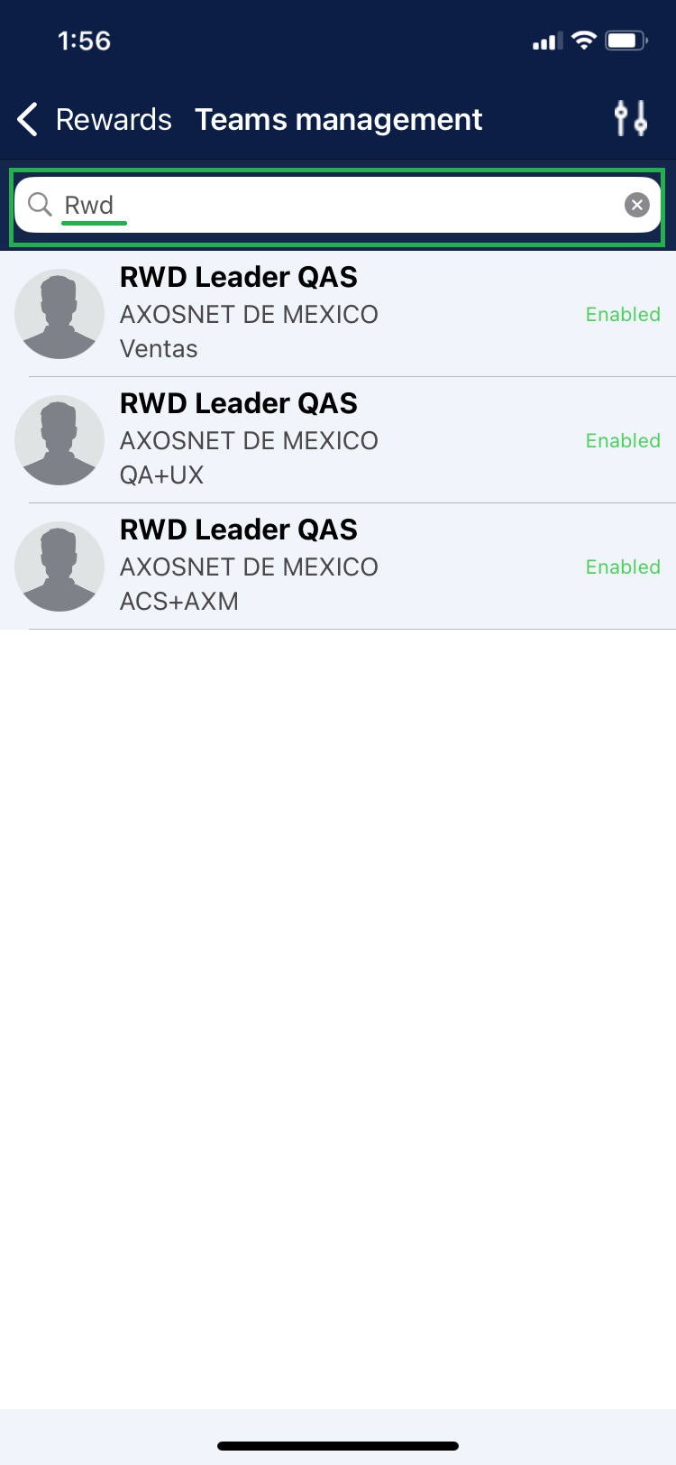 Note: To facilitate quick identification of a team, use the “Search” tool by entering the name of the leader assigned to the team you need to find.