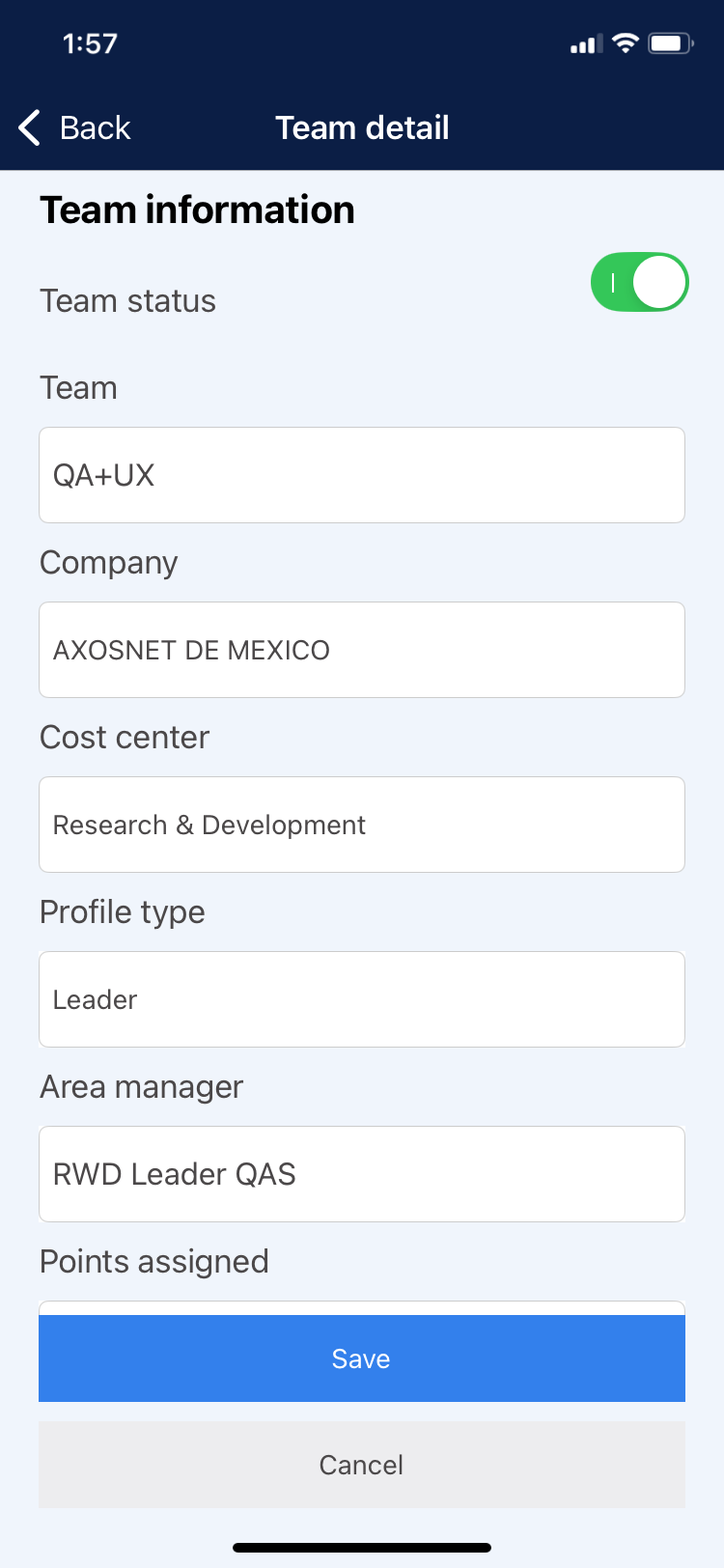 The “Team Management” section allows displaying the details of each registered team, and enables the Super Administrator to modify the status and the amount of points assigned so that team leaders can perform the corresponding approvals.