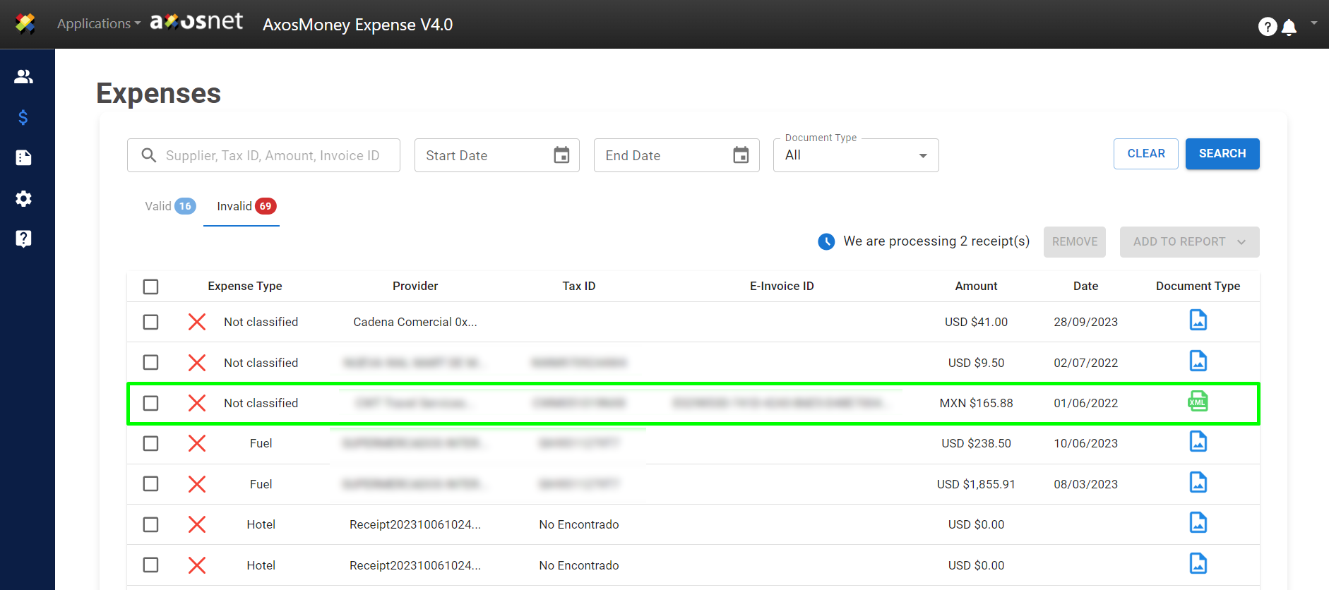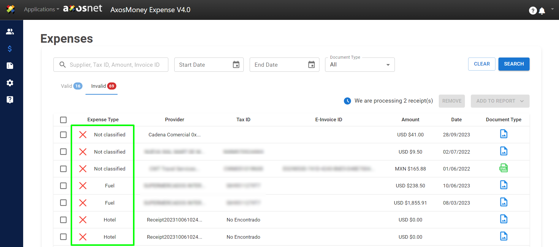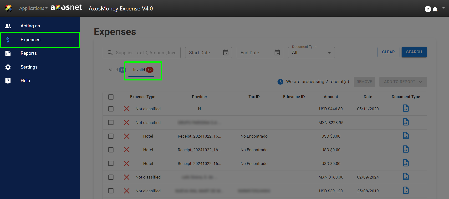 1.Go to the “Expenses” page. Click on the “Invalid” tab.