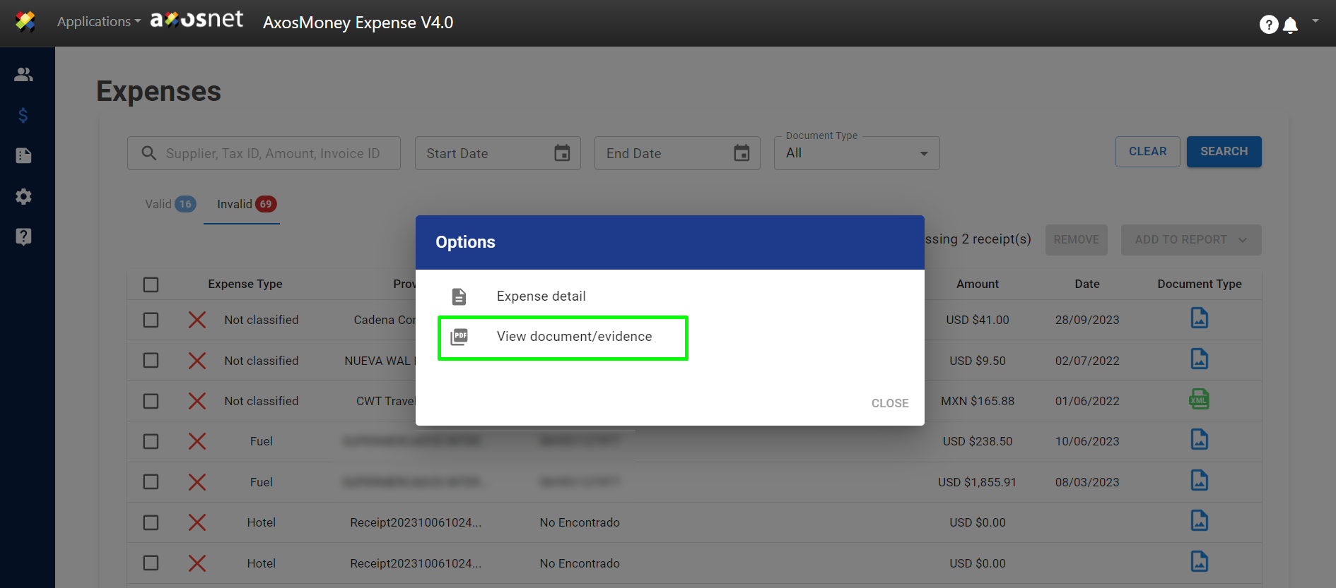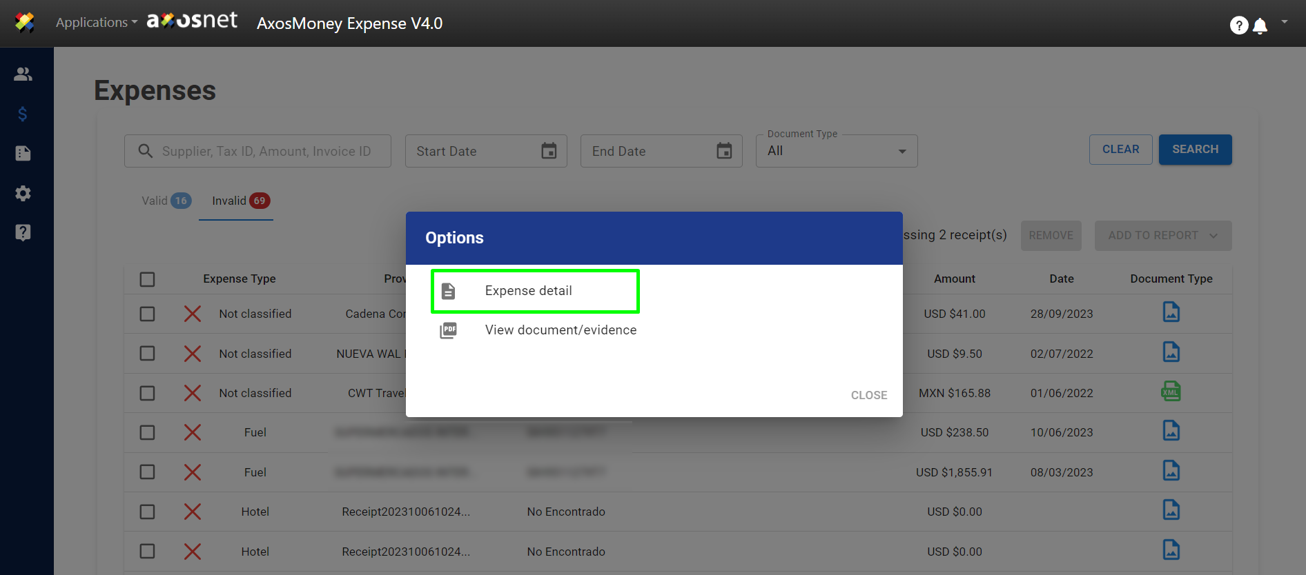 Unlike Valid Expenses, Invalid Expenses can only be viewed for details or deleted.