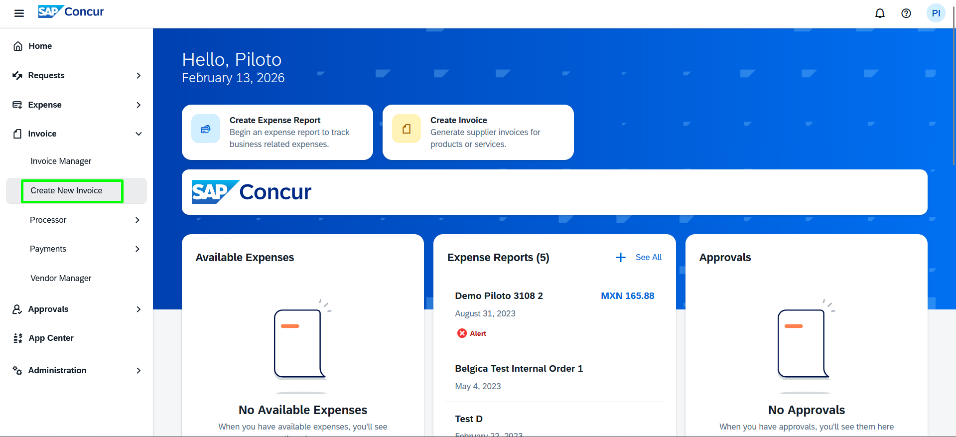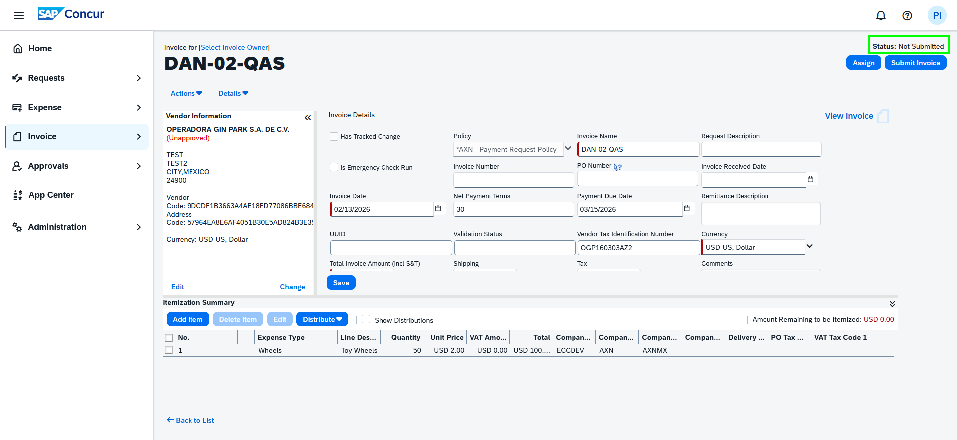 4. This invoice created in SAP Concur will appear in ACP in the Invoice Entry section.