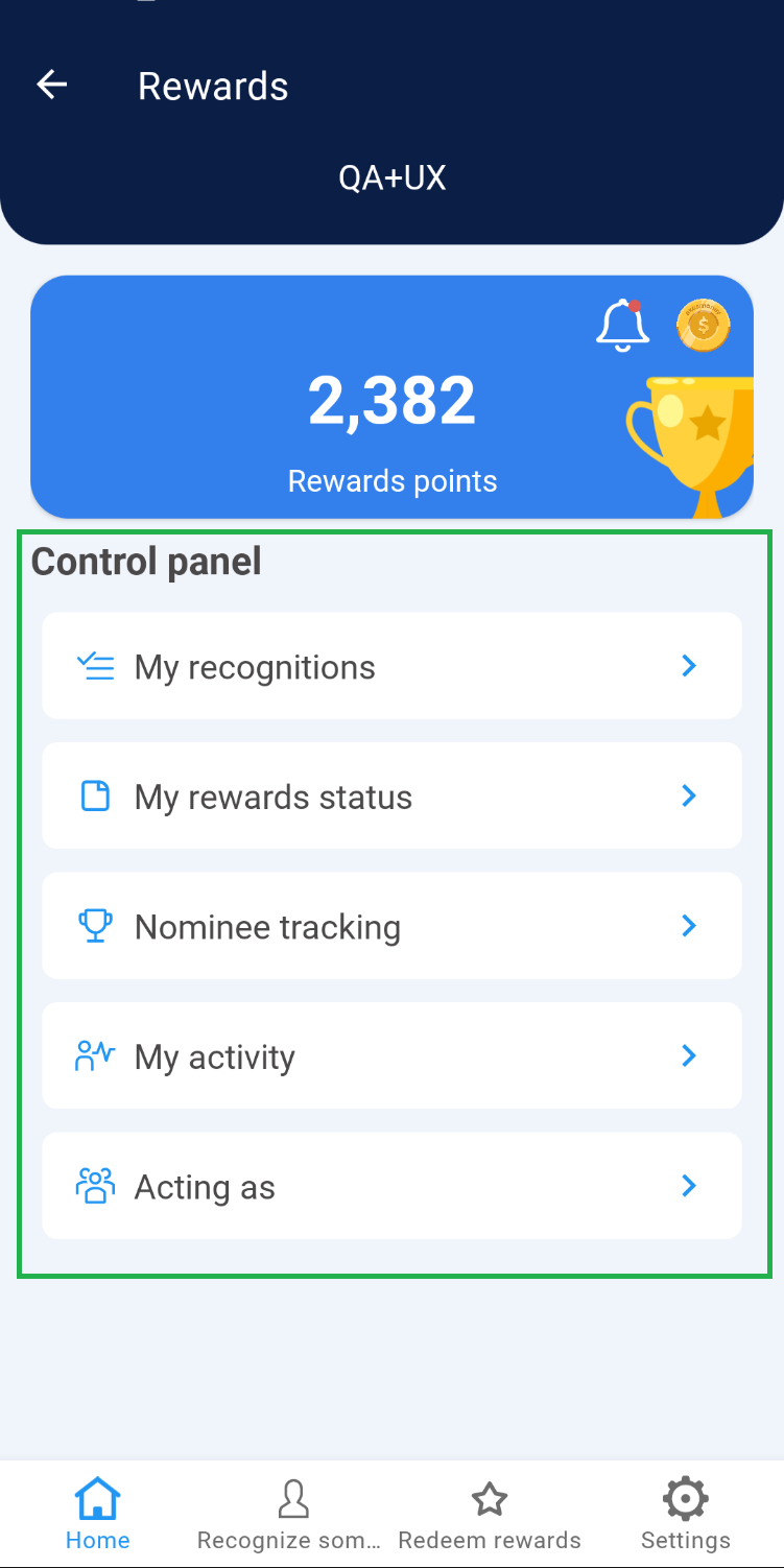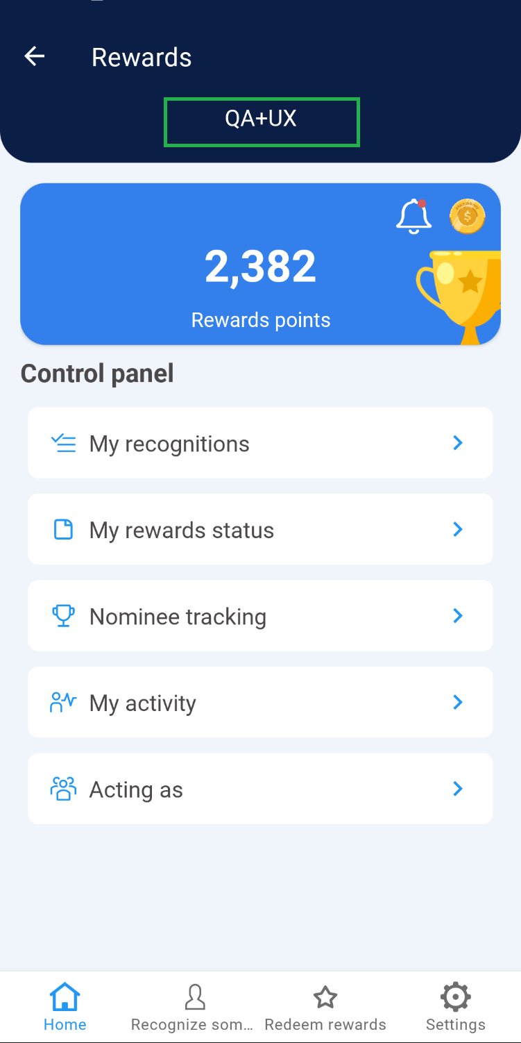 1. Rewards will display the home page, as well as the name of the team you belong to located at the top of the screen.