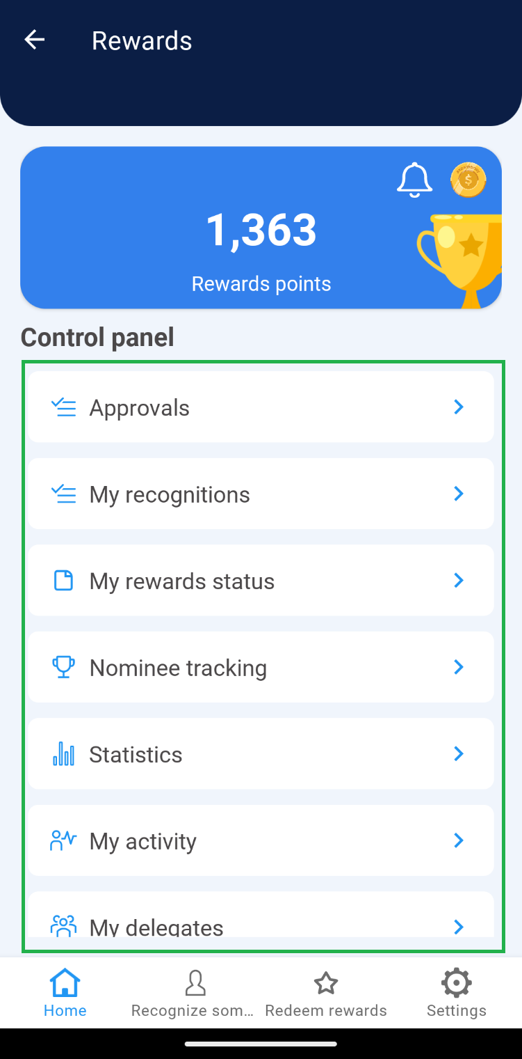 1. You will identify the Rewards home page, as well as the options available to a team leader.