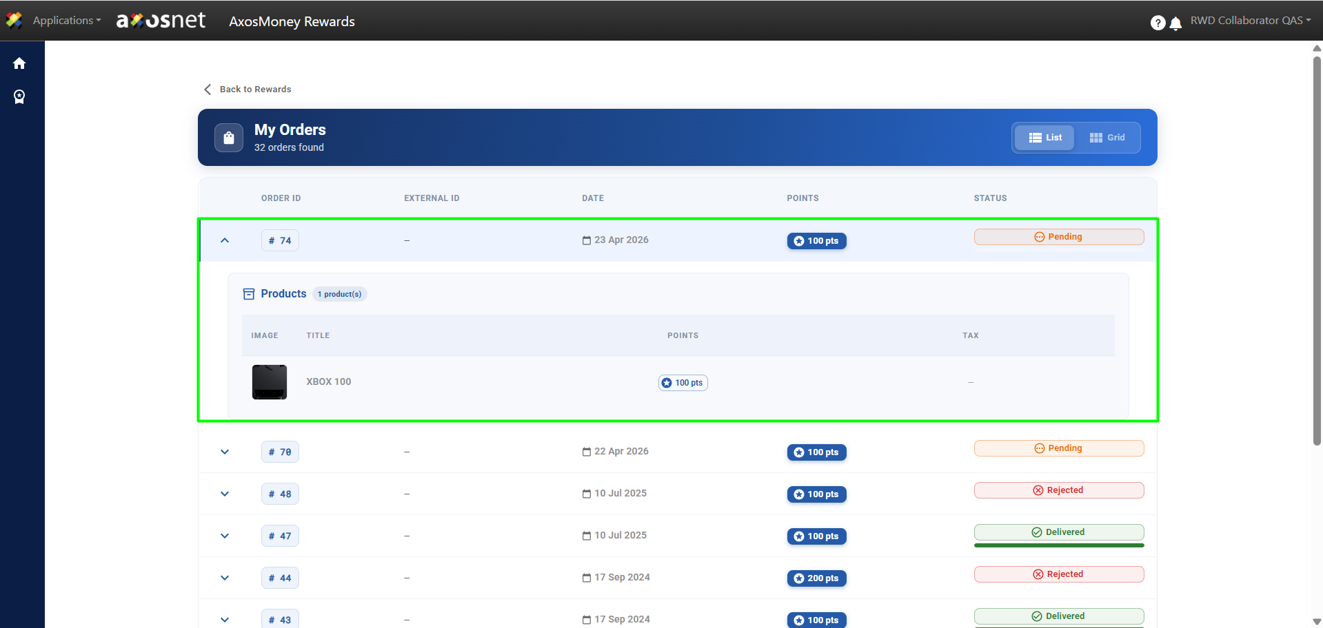 In the Quick Actions section of AxosMoney Rewards, the collaborator can monitor the status of the rewards they have redeemed. Here they can check if they have been approved or rejected and, in the case of rewards from the Amazon catalog, consult their delivery status.