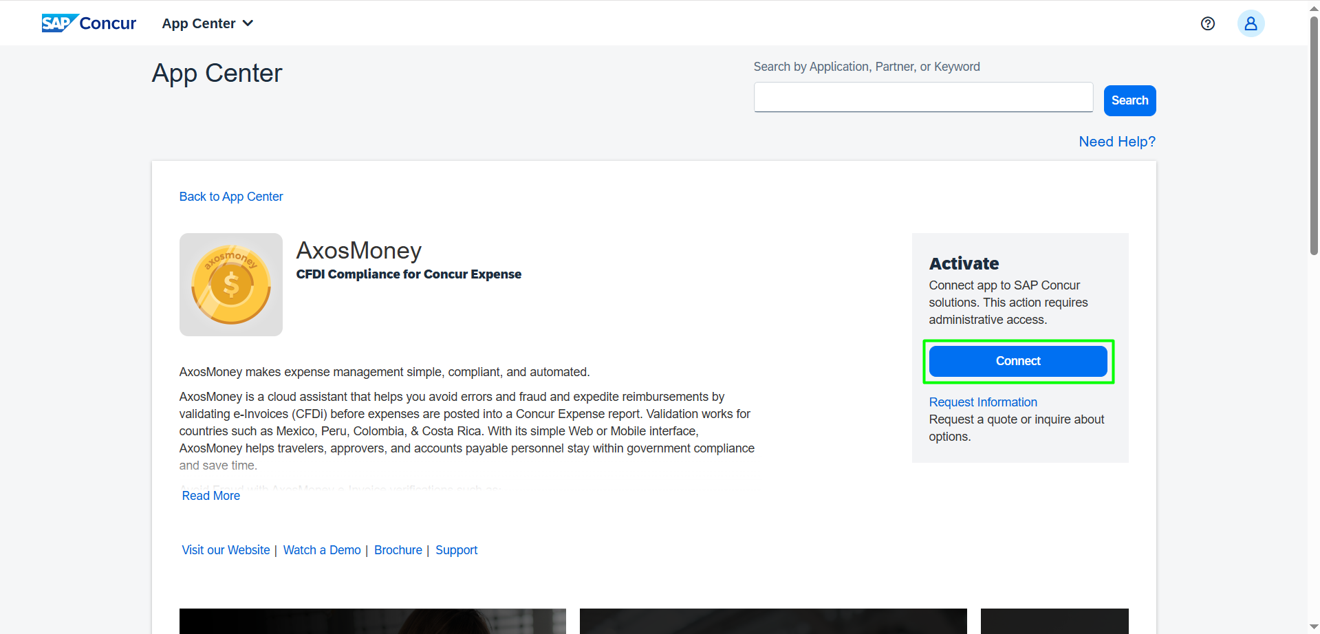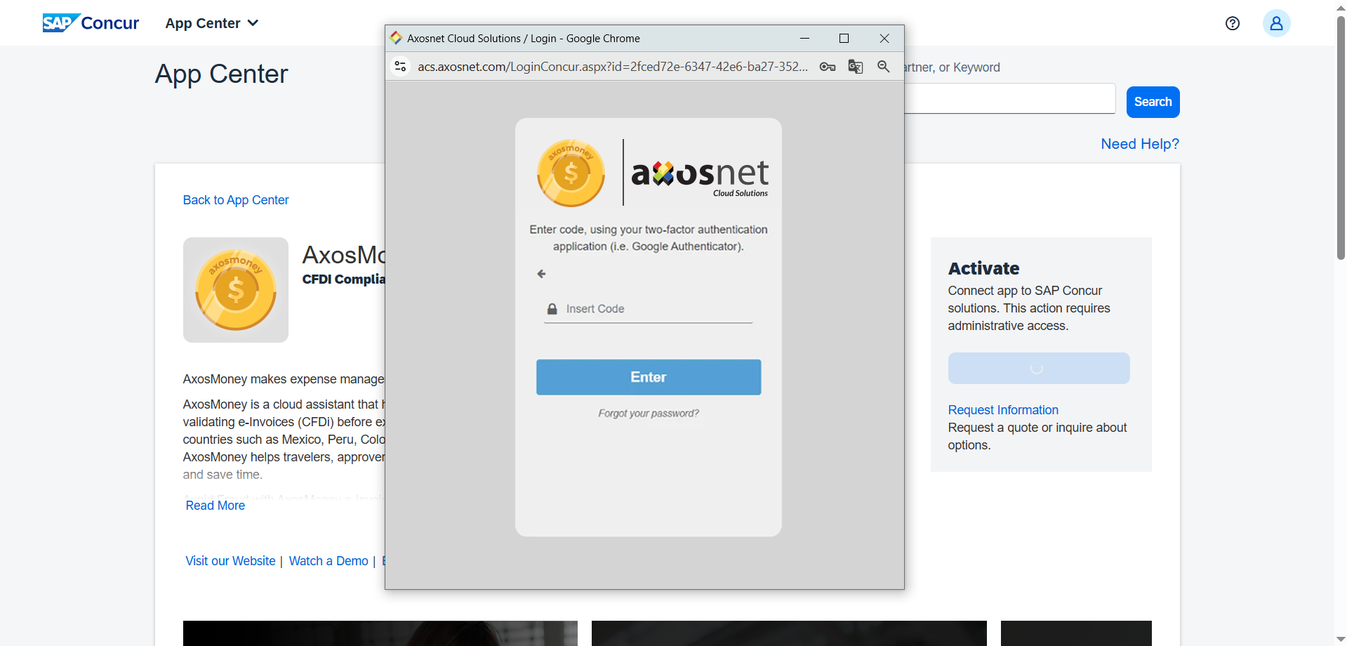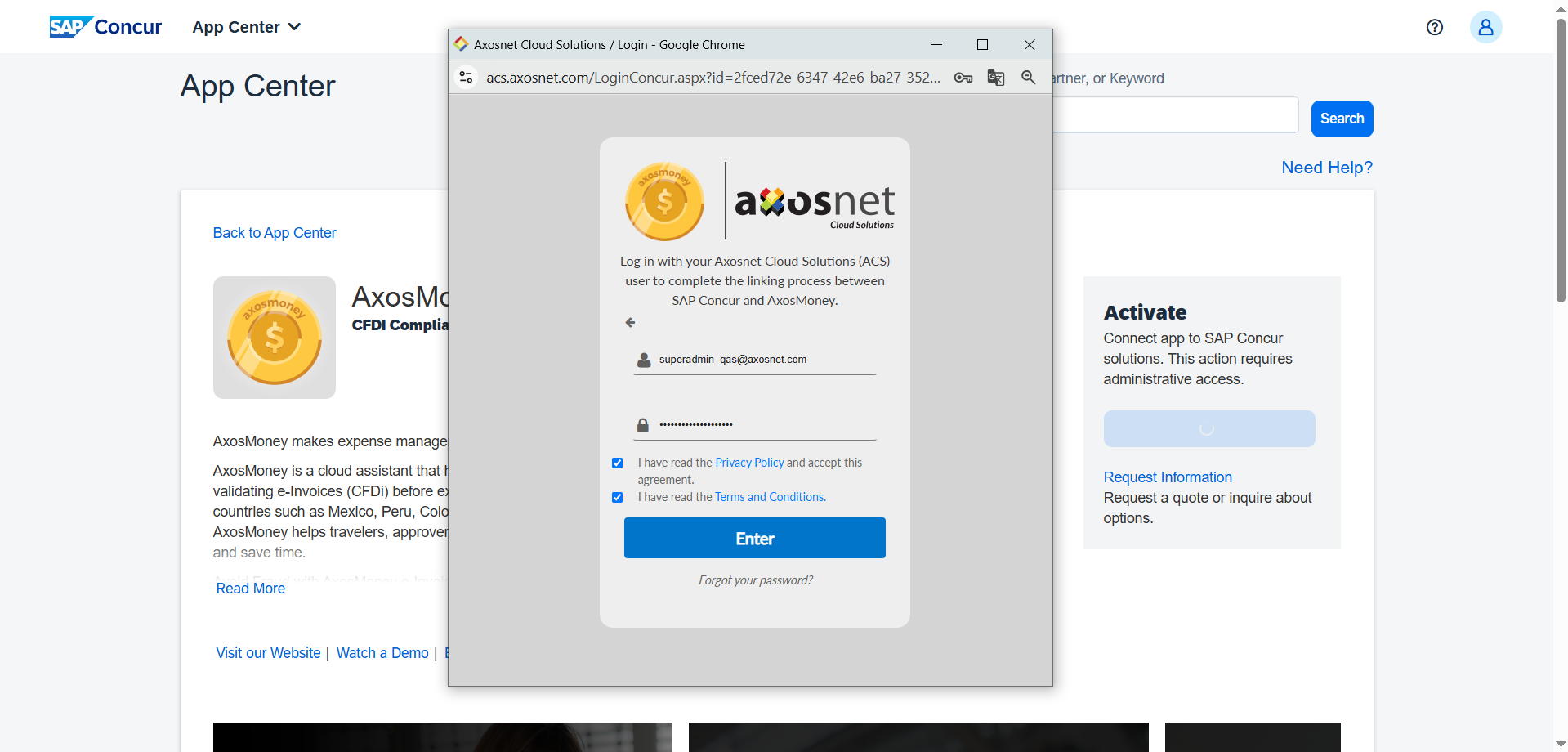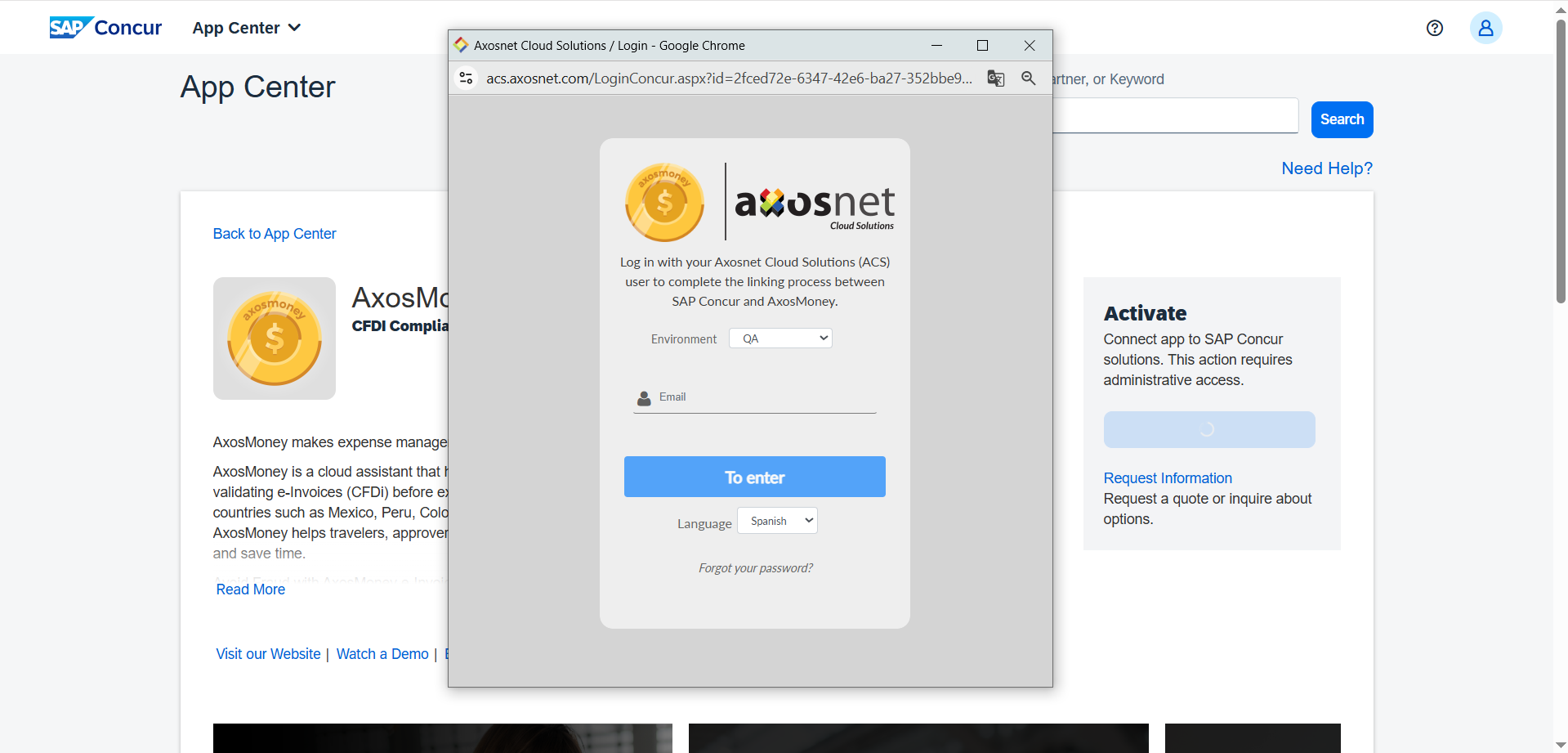 Quick Connect describes the process clients use to connect their Concur site with Axosnet’s application; this process is established at the beginning when your company starts using the AxosMoney App, and the SAP Concur Administrator does it. The quick connection allows AxosMoney’s features like report creation and the use of delegates.