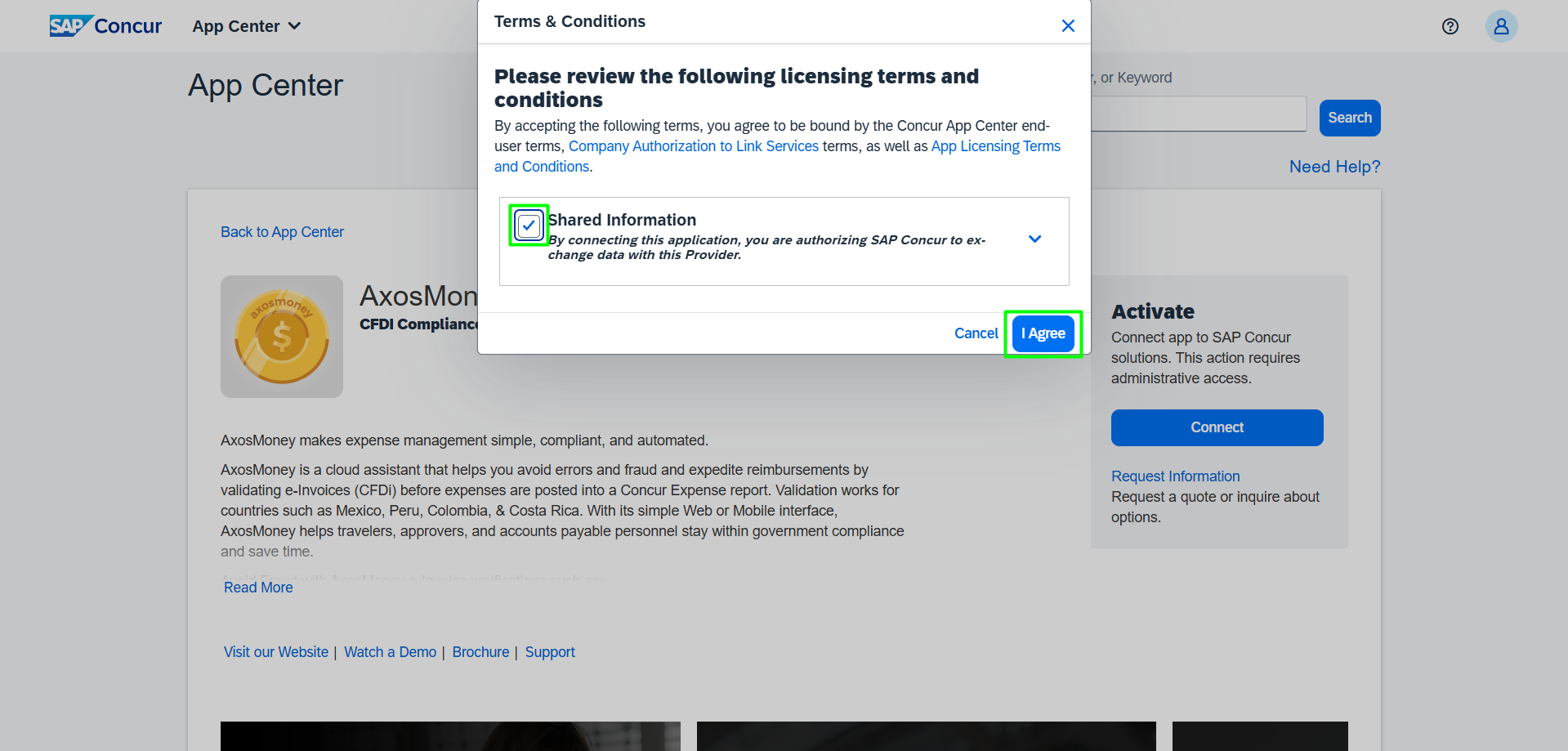 2. In the “TERMS AND CONDITIONS” window, check the “Shared Information” checkbox and click on the “I Agree” button.