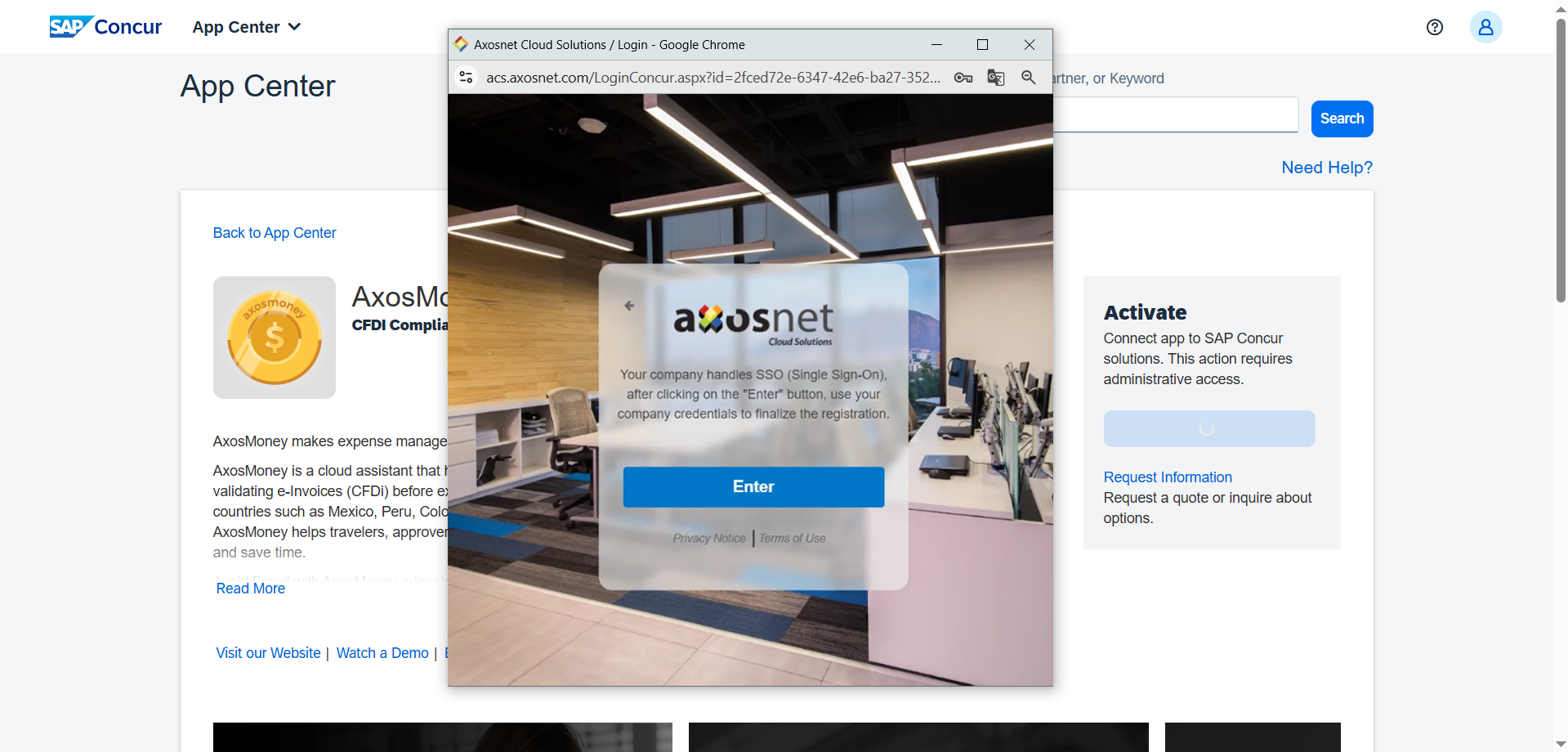 This section explains how to make a Quick Connection if your company has activated the Single Sign-On (SSO) feature. If you are the account administrator for Axosnet Solutions and need further details, please refer to the Configure SSO section on the Axosnet Cloud Solutions page.
