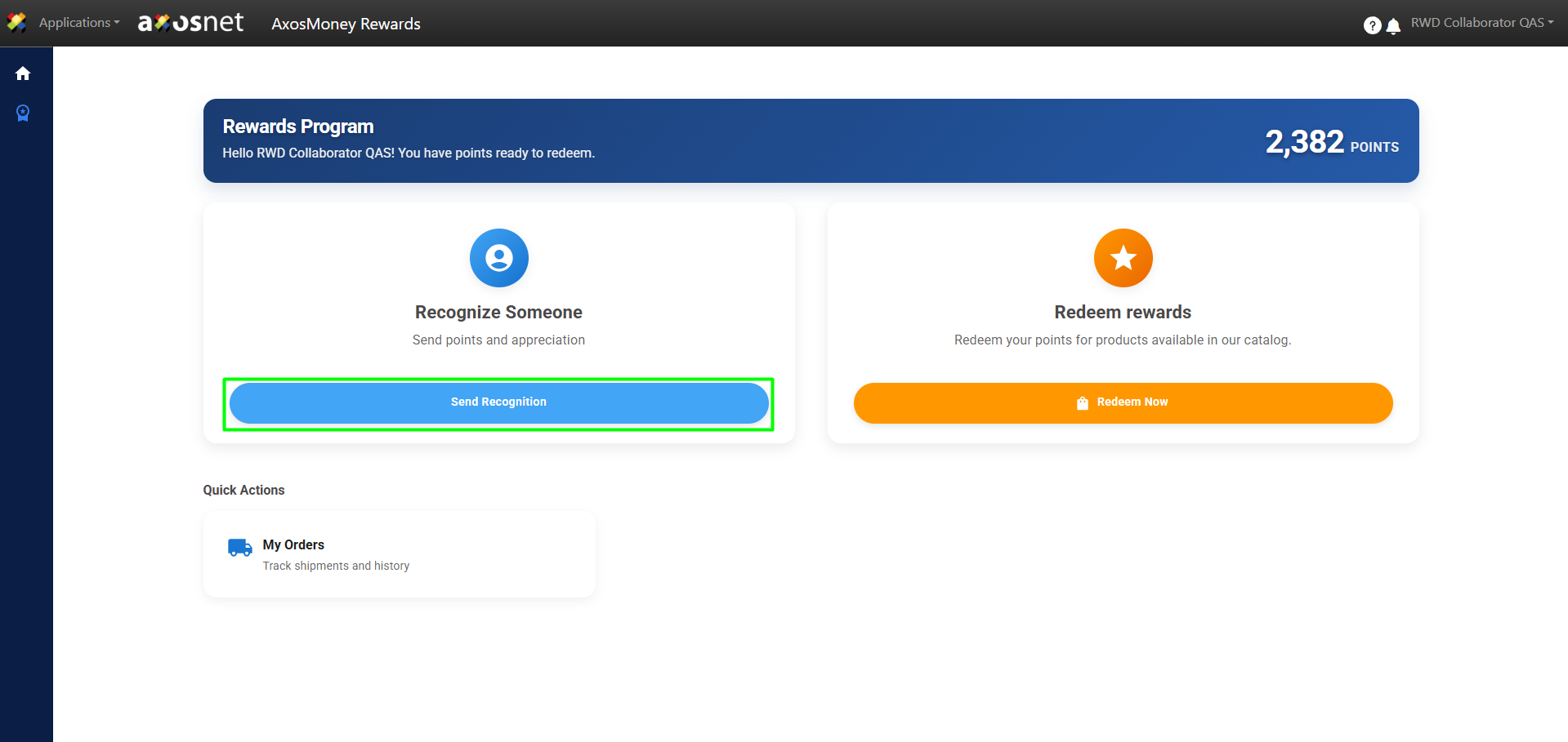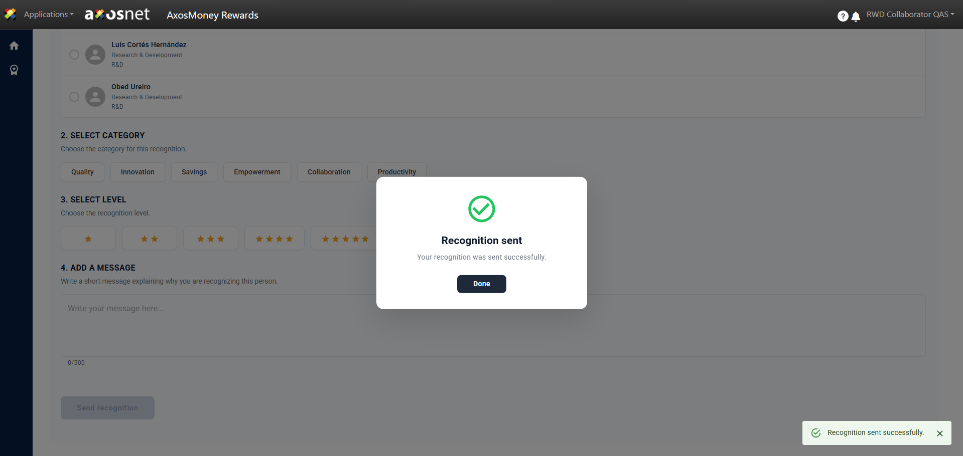 In the AxosMoney Rewards section, the Collaborator has the ability to recognize and reward the effort of their colleagues. This recognition translates into earning Rewards points, which can subsequently be used to redeem various rewards.
