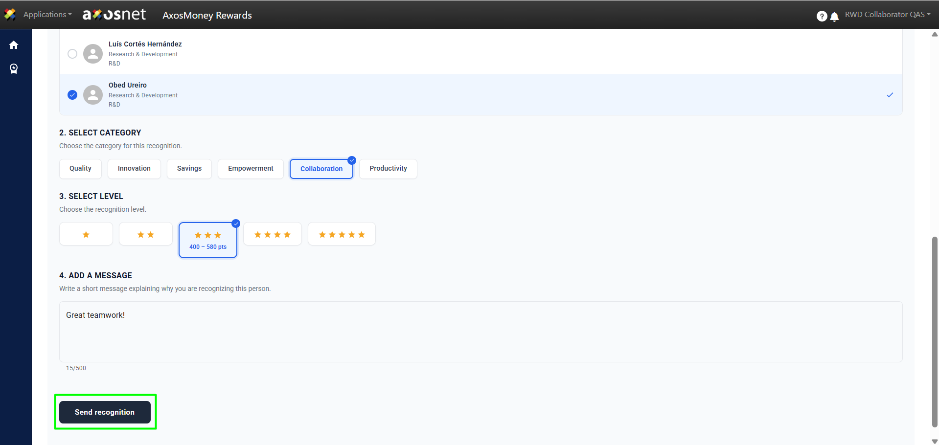 5. To send a recognition, you must choose the Collaborator(s) to recognize, select the category and level of the recognition, and finally include a concise message explaining the reason for the recognition. Finally, click on Send Recognition.