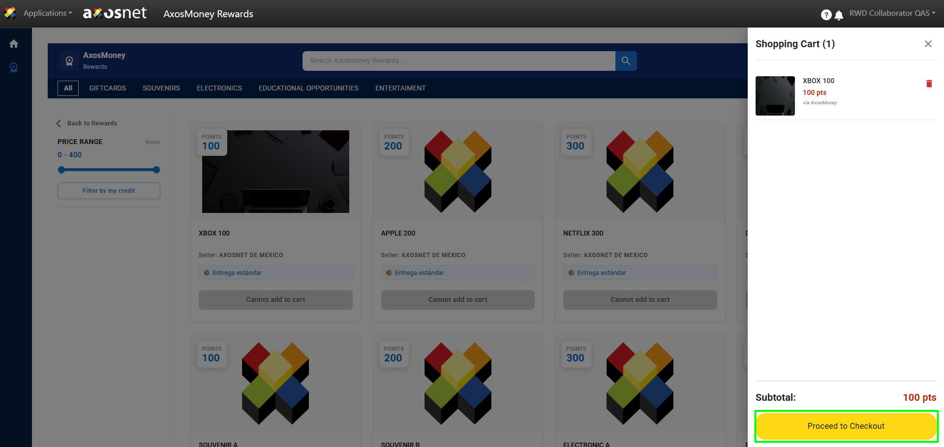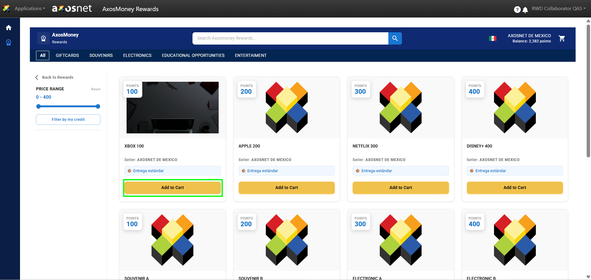 Note: It is possible to filter the products by category at the top or by their price in points using the filter in the left sidebar menu.