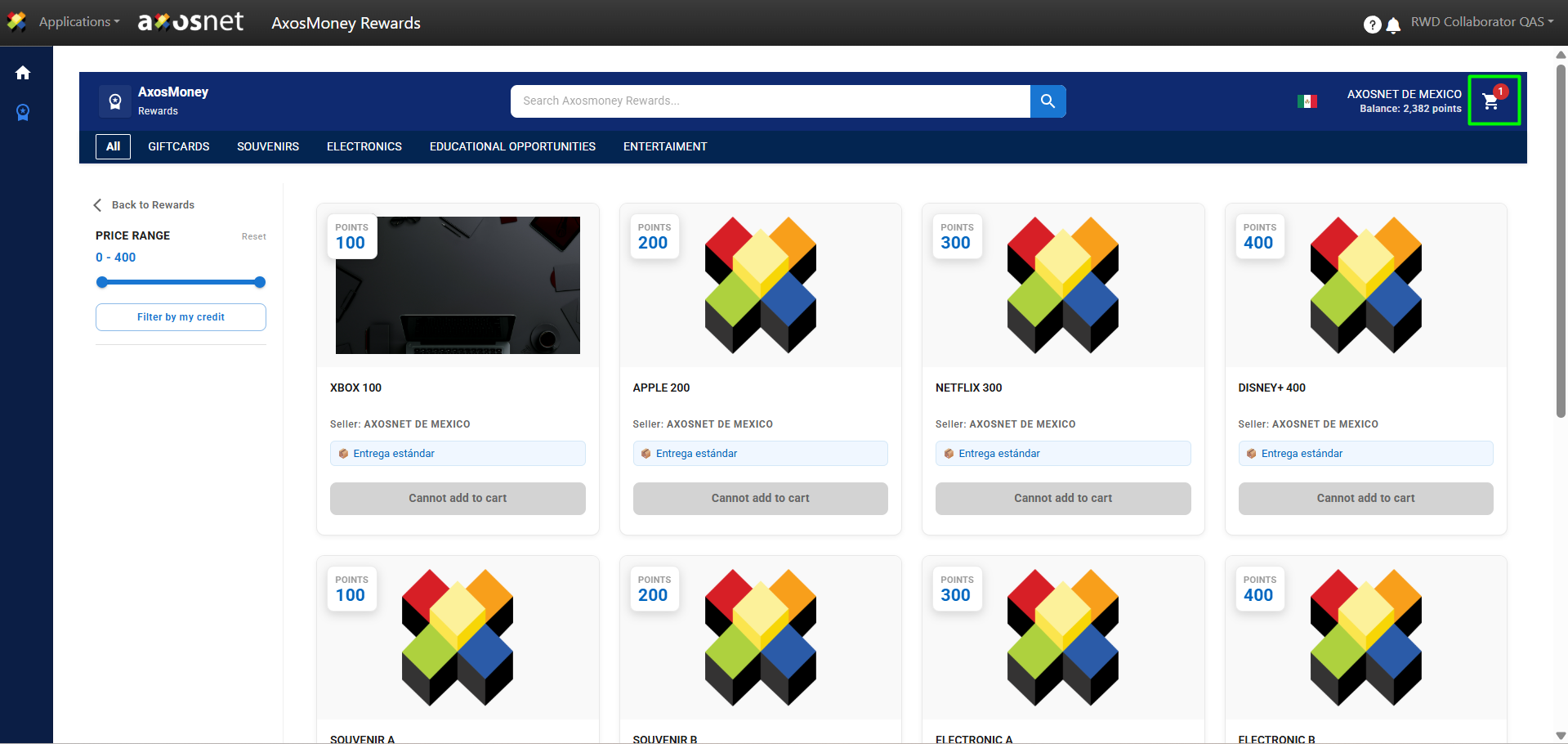 In the AxosMoney Rewards section, the Collaborator can use their accumulated points to redeem them for different rewards. These rewards include Souvenirs, Gift Cards, Courses, or the option to select an item from a predefined Amazon Business catalog.