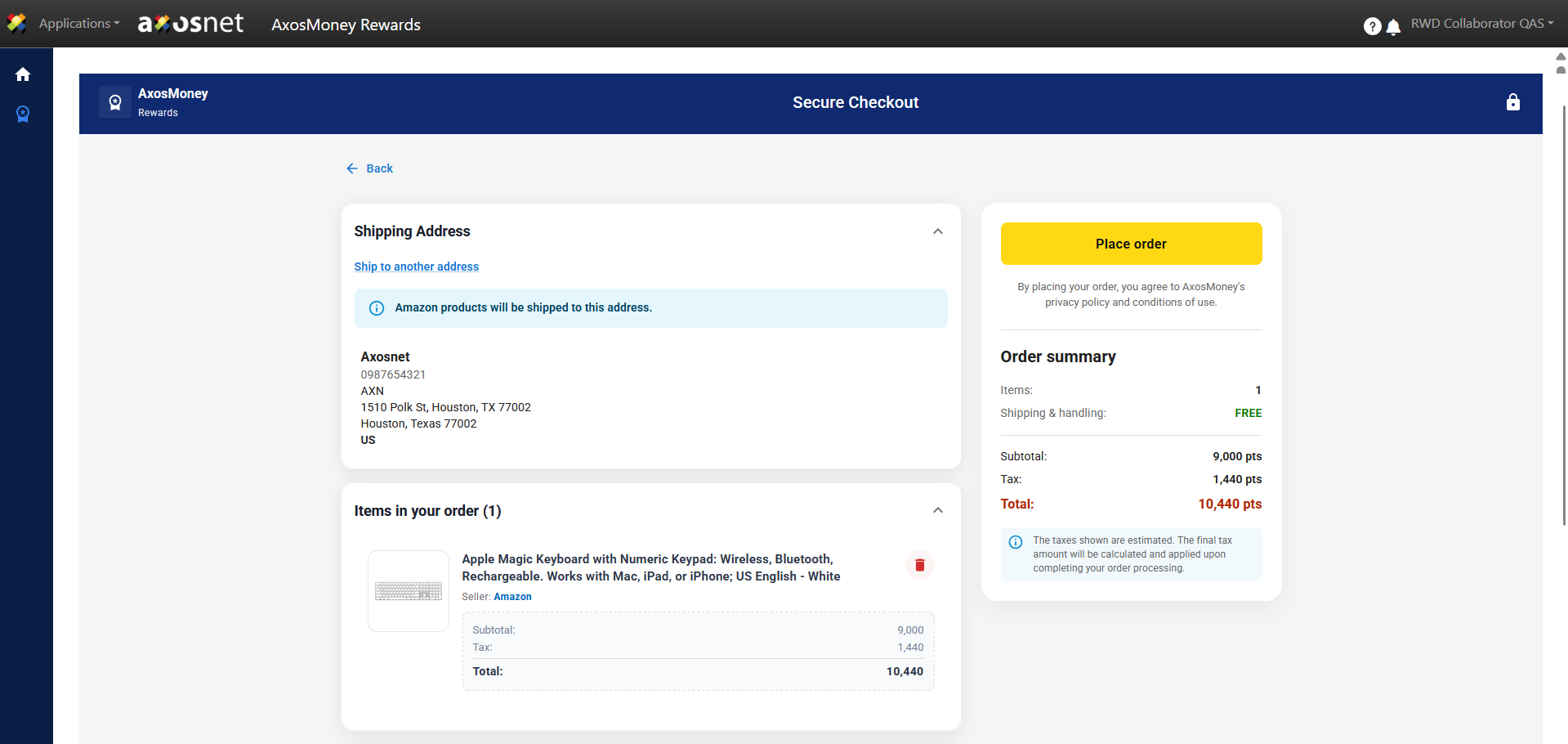 7. To confirm the reward redemption, click on Place Order.