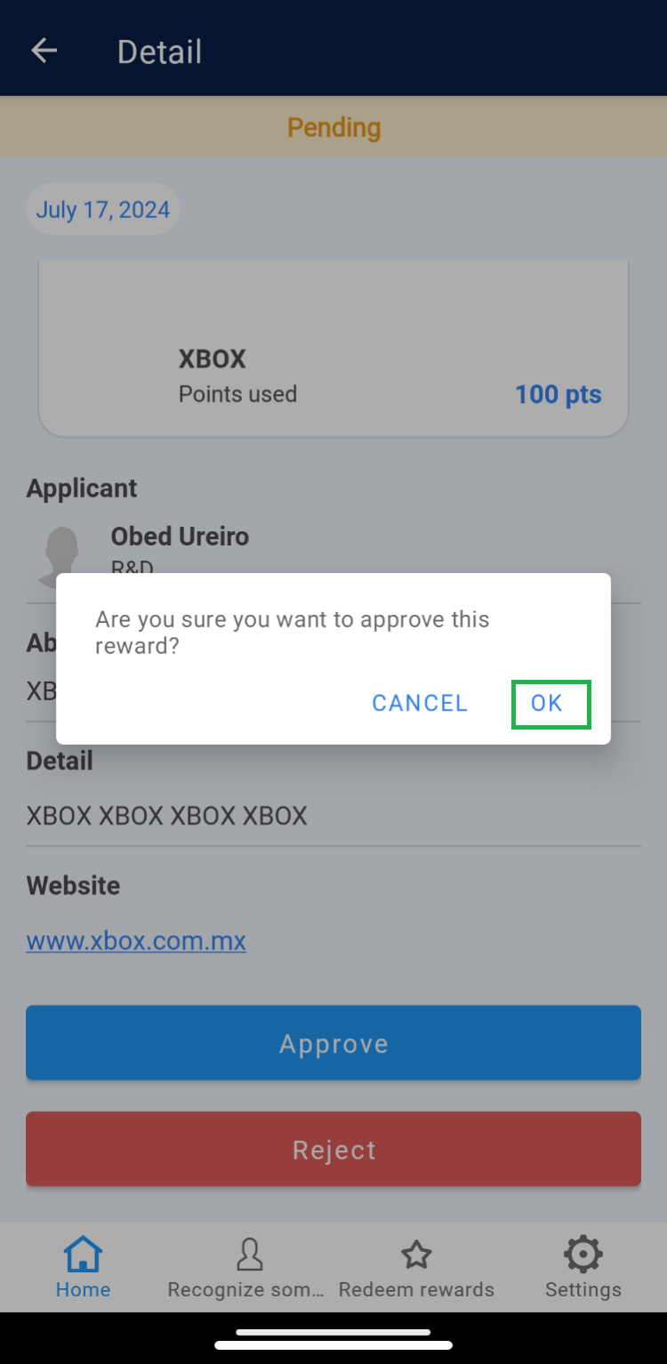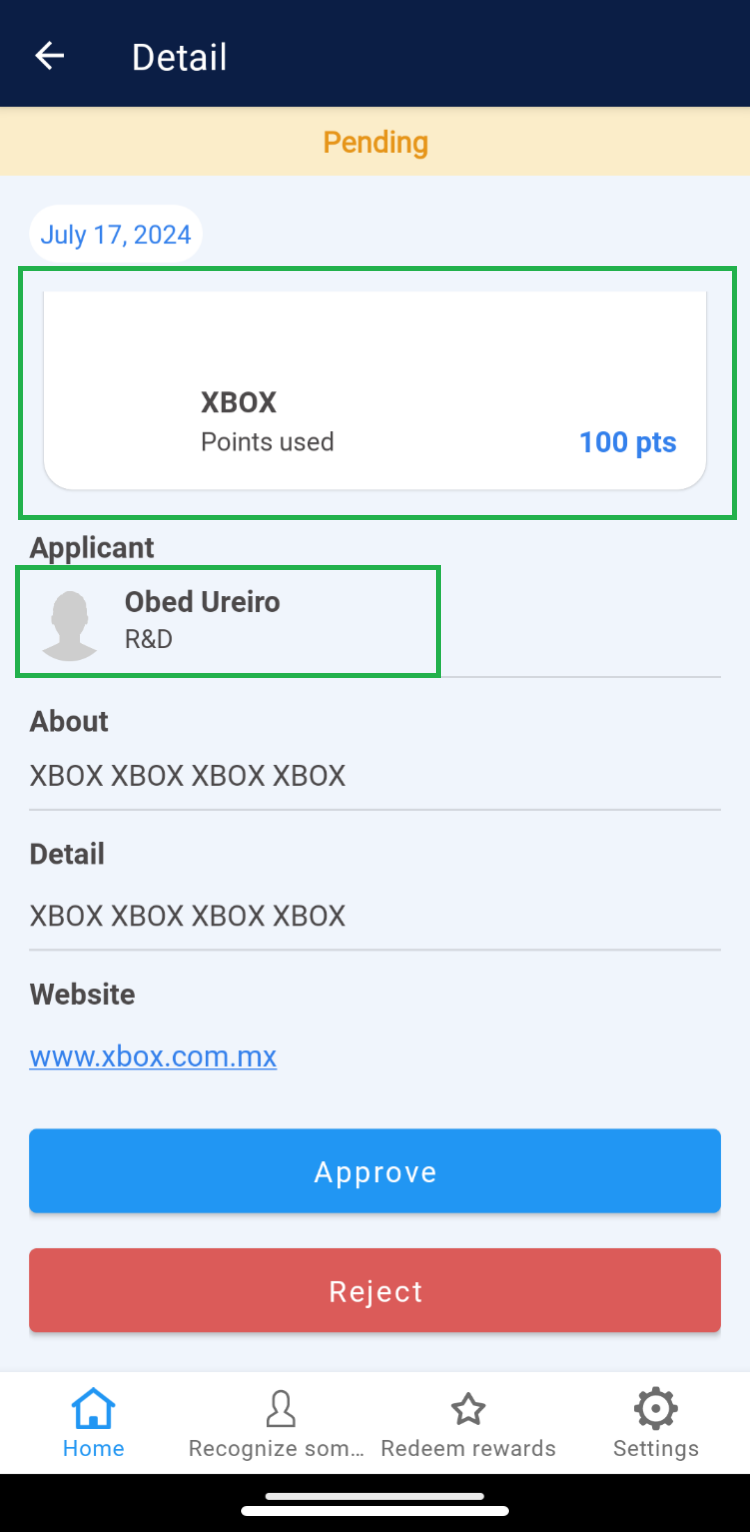 The Super Administrator is responsible for approving or rejecting orders requested by team members when redeeming their points. 1. Select an order from the “My Orders” list under the “Pending” tab. 2. Within the details, identify the redeemed product and the requester.
