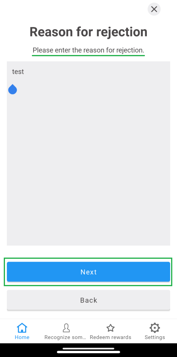 2.2 Enter the reason for not approving the order, then click “Next” to finalize. 3. Orders will be removed from the “Pending” tab and reflected in either the “Approved” or “Rejected” tabs based on the action taken. Note: If there are records of rejected orders dated before the current month, use the “Date” filter to view records within the corresponding list.