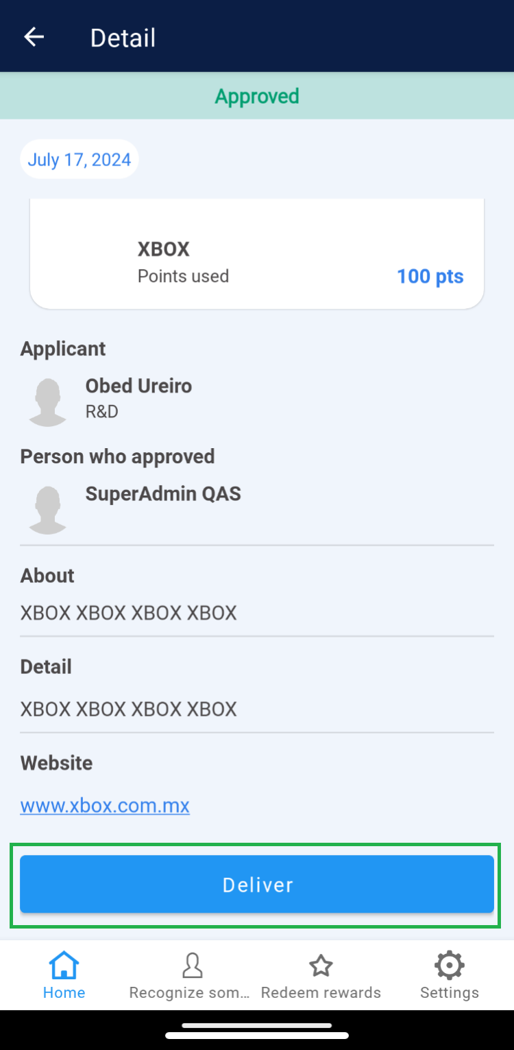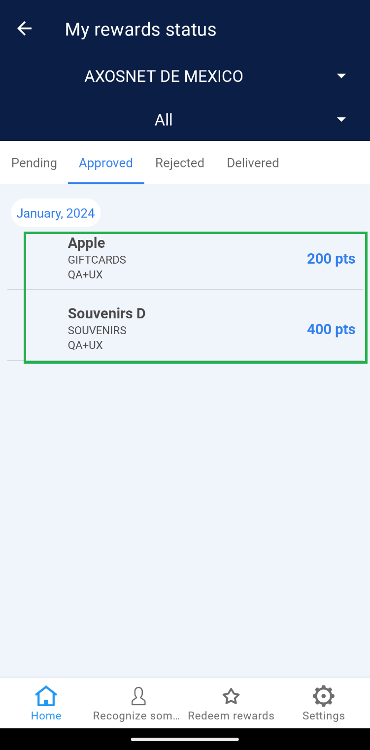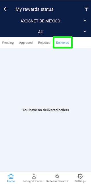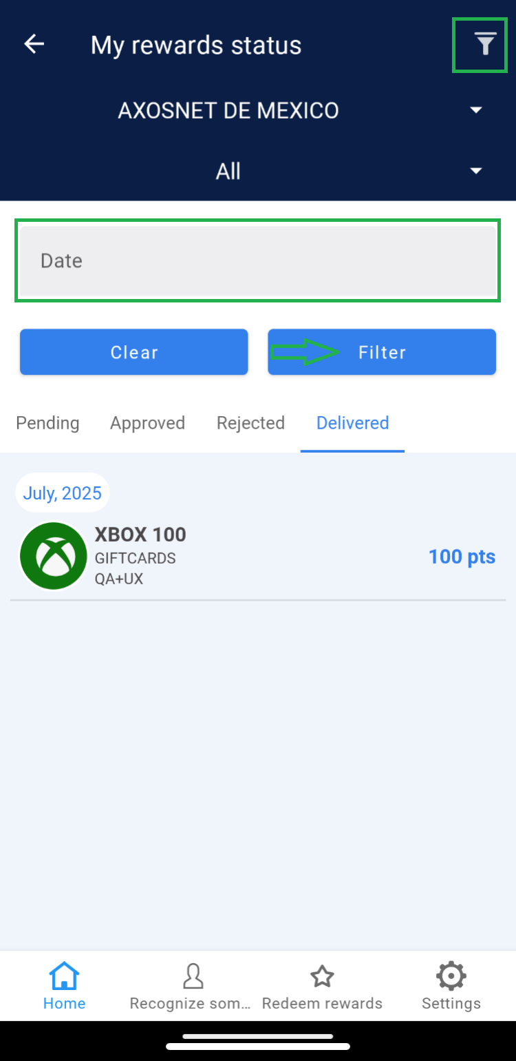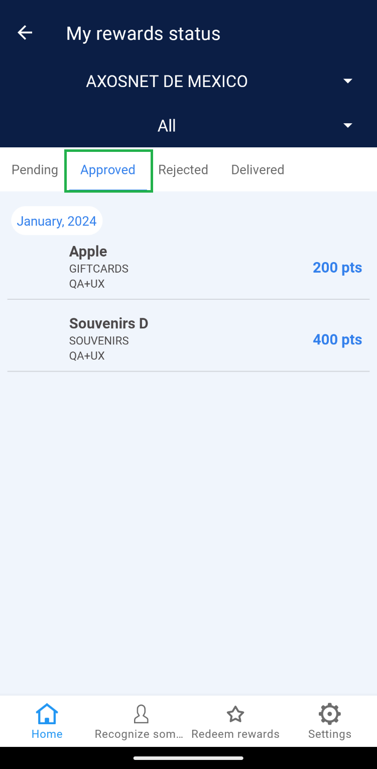 Once the employee’s request has been “Approved,” the Super Administrator should change the order status to “Delivered” at the moment the redeemed product is handed over to the user. 1. Select the “Approved” tab. 2. Choose the order you wish to deliver. 3. Click on the “Deliver” button and confirm by clicking “Understood”. 4. The order will be removed from the “Approved” section and reflected in the “Delivered” tab. Note: If there are records of orders dated before the current month, use the “Date” filter to view records within the corresponding list.