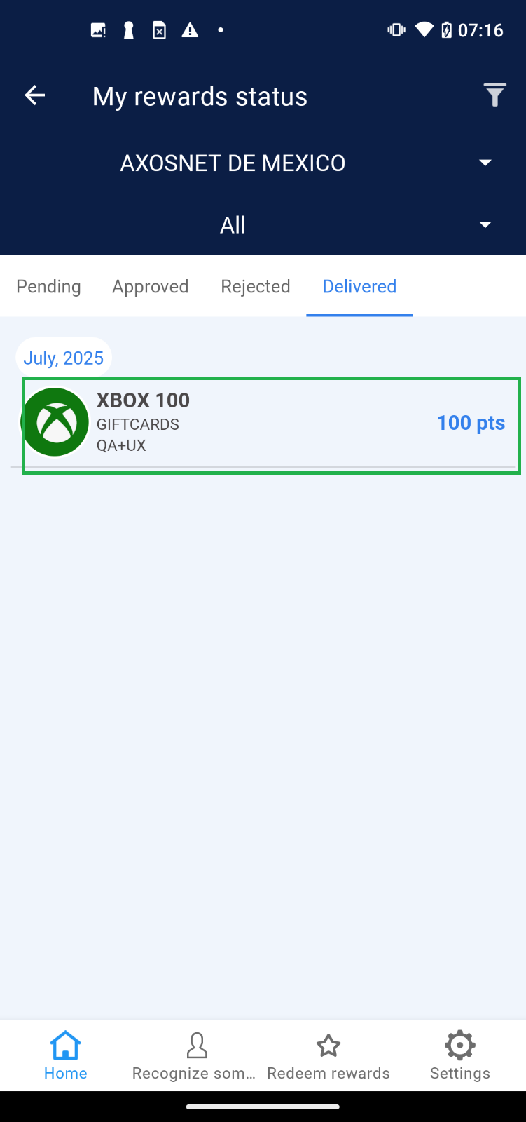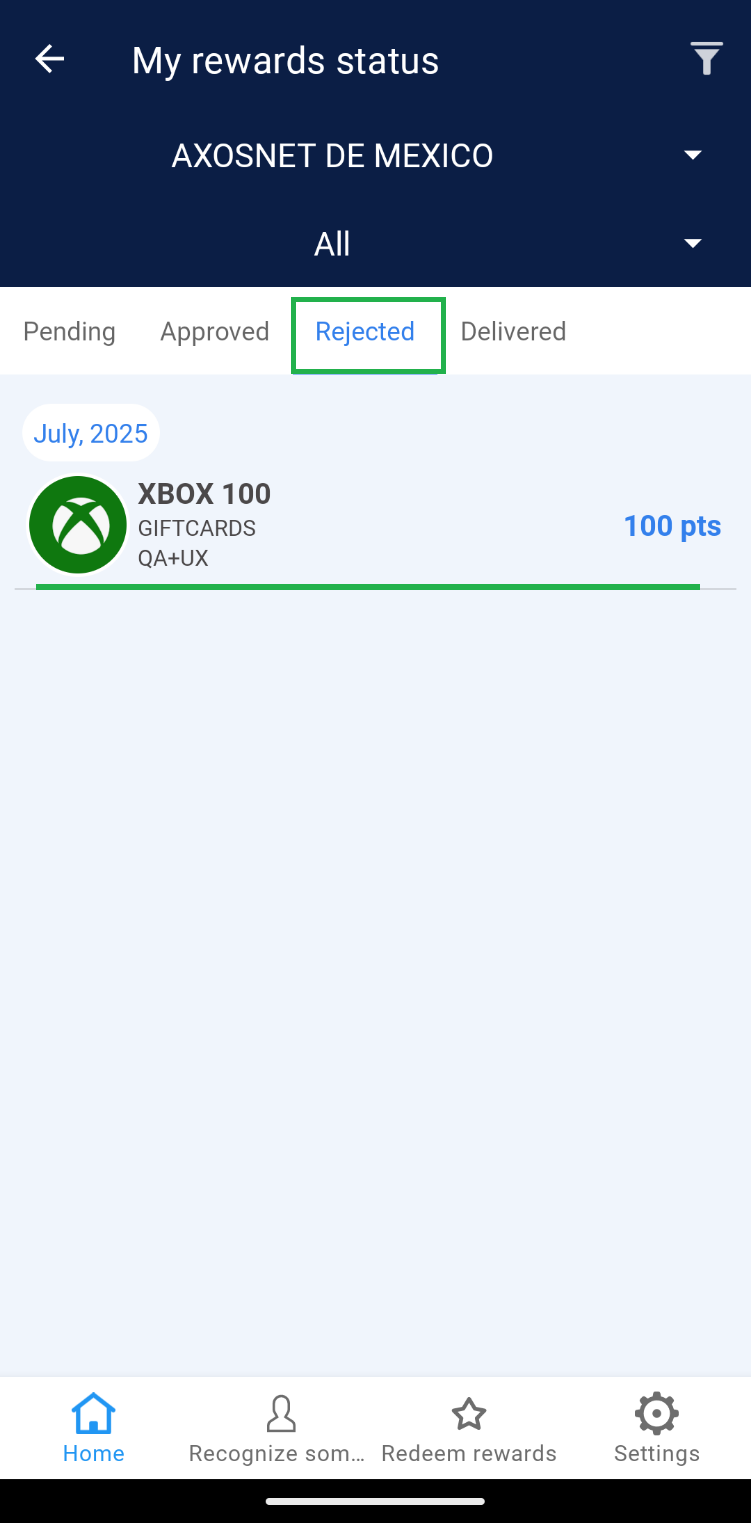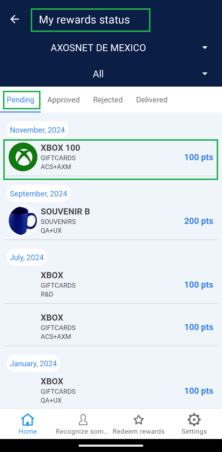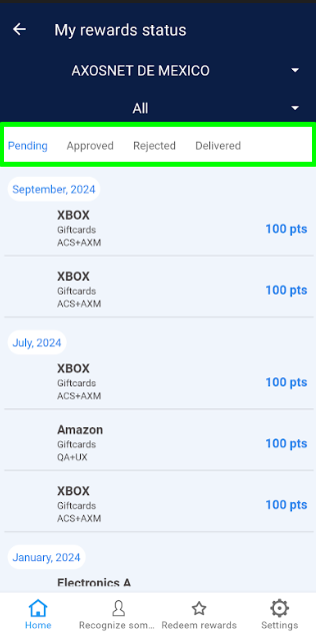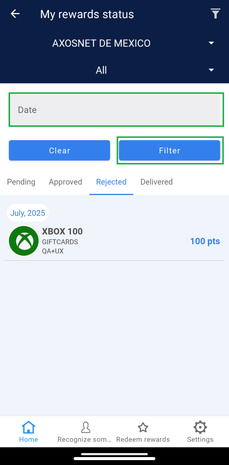 Once the employee’s request has been “Approved,” the Super Administrator should change the order status to “Delivered” at the moment the redeemed product is handed over to the user. 1. Select the “Approved” tab. 2. Choose the order you wish to deliver. 3. Click on the “Deliver” button and confirm by clicking “Understood”. 4. The order will be removed from the “Approved” section and reflected in the “Delivered” tab. Note: If there are records of orders dated before the current month, use the “Date” filter to view records within the corresponding list.