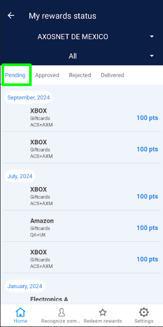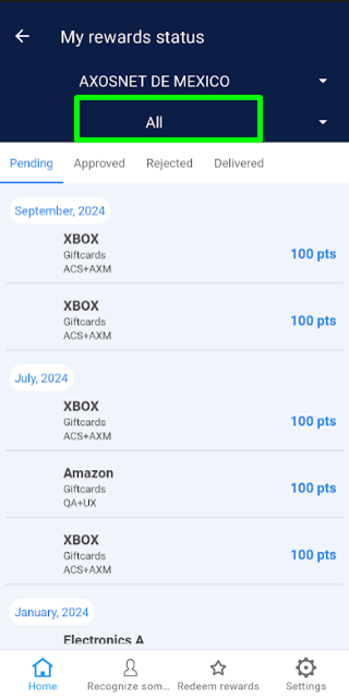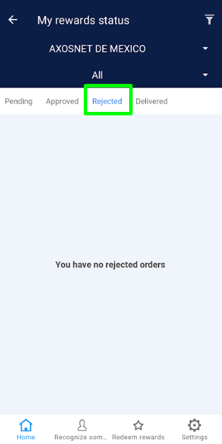 Below are the actions that a Super Administrator will perform within the “My Orders” section: 1. Within the Rewards control panel, select the “My Orders” option. 2. In the dropdown menu, you’ll find the default option “All”. If needed, select a team to view specific information. Note: Ensure the company to which the teams needing management are integrated is selected. 3. Four options are displayed: “Pending, Approved, Rejected, and Delivered”. 4. Click on the “Pending” tab to identify all orders requested by team members of a specific team or all teams belonging to the selected company. 5. Select the “Approved” tab to view the list of all orders that the Super Administrator has approved but have not yet been delivered. 6. Click on the “Rejected” section to view the list of orders that have been declined. 7. Choose the “Delivered” tab where orders already delivered to the requesting team member are listed.