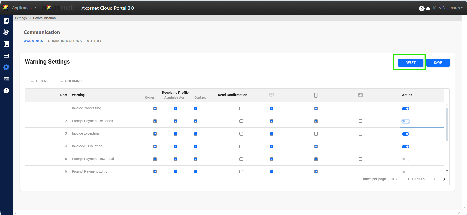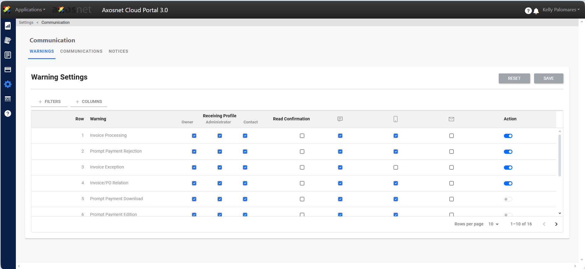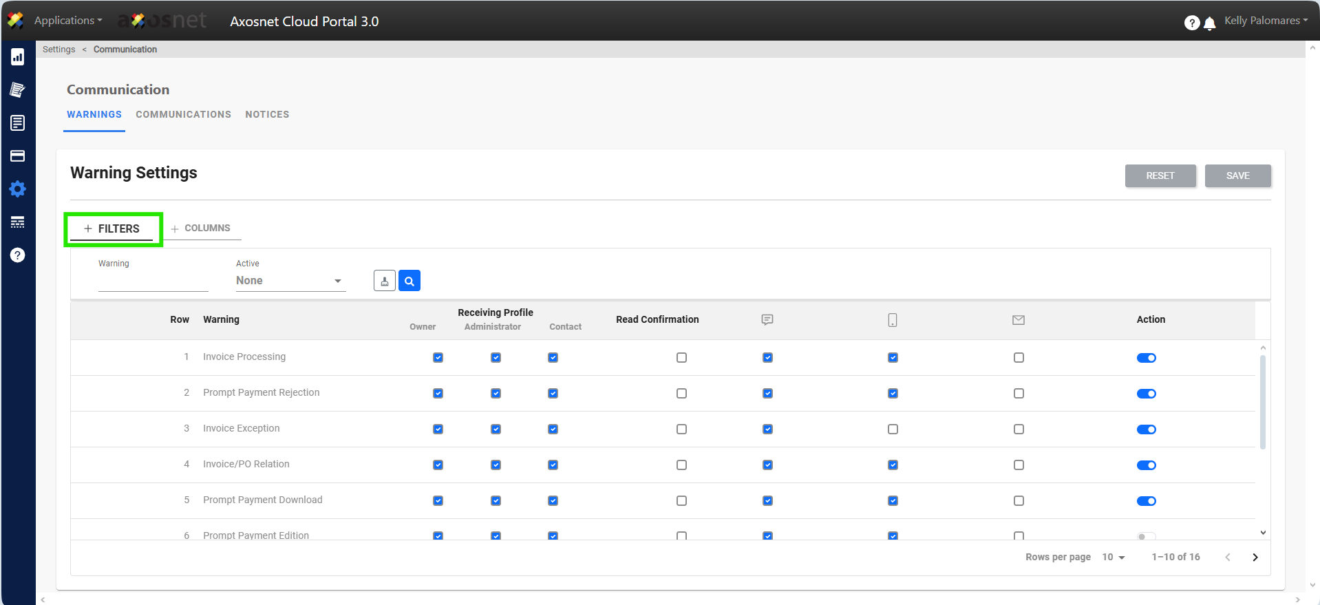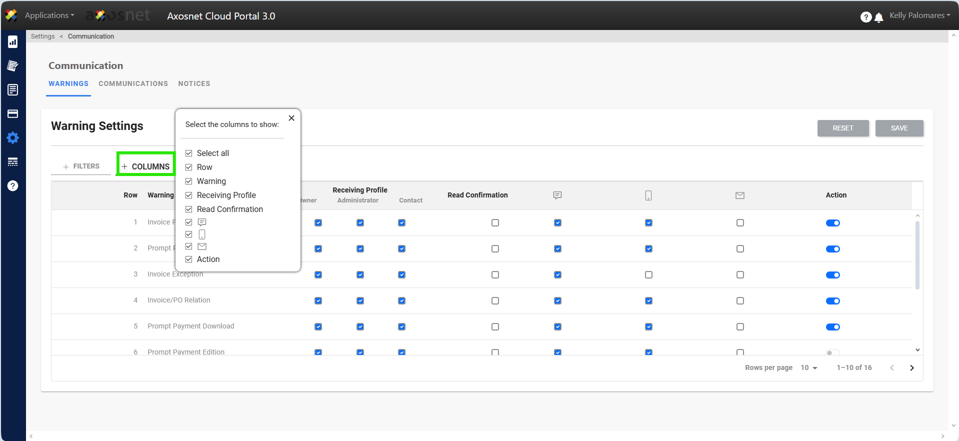 In the Warnings section we will have the option to search using filters or hide/show the necessary columns.