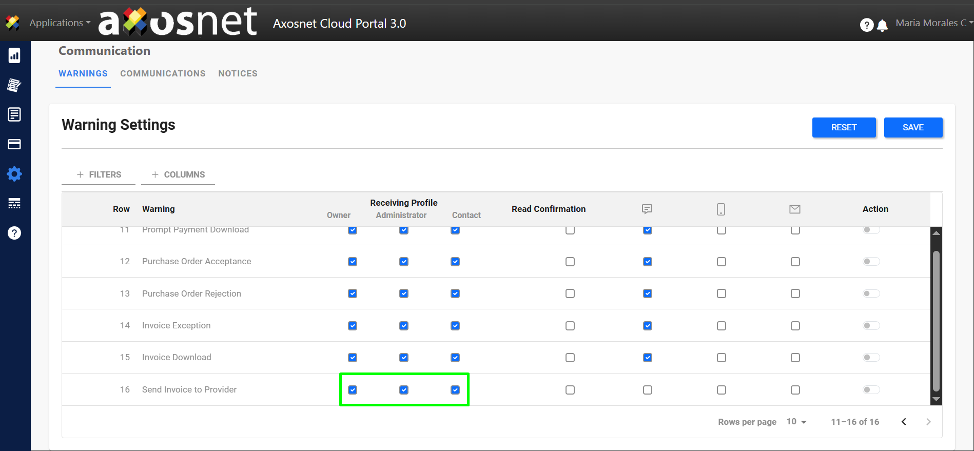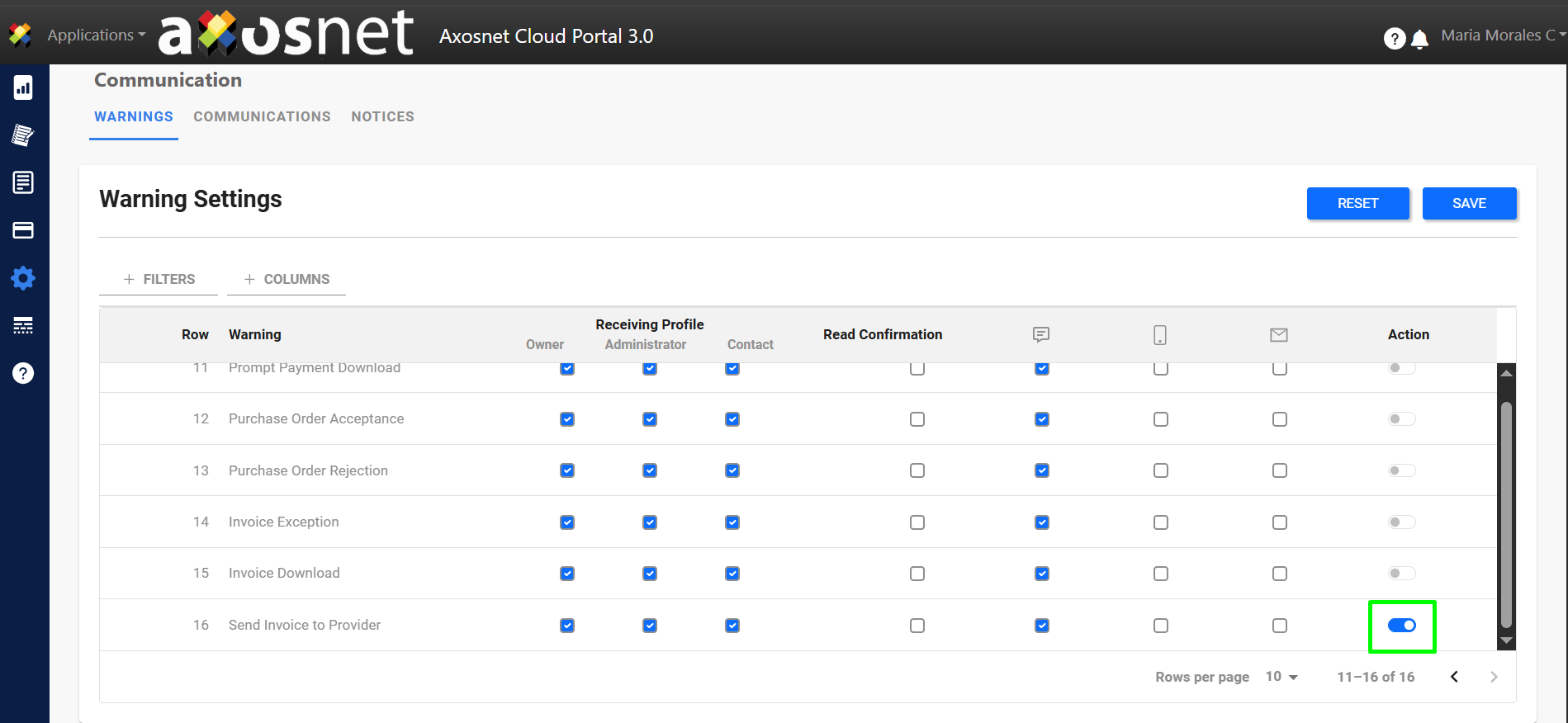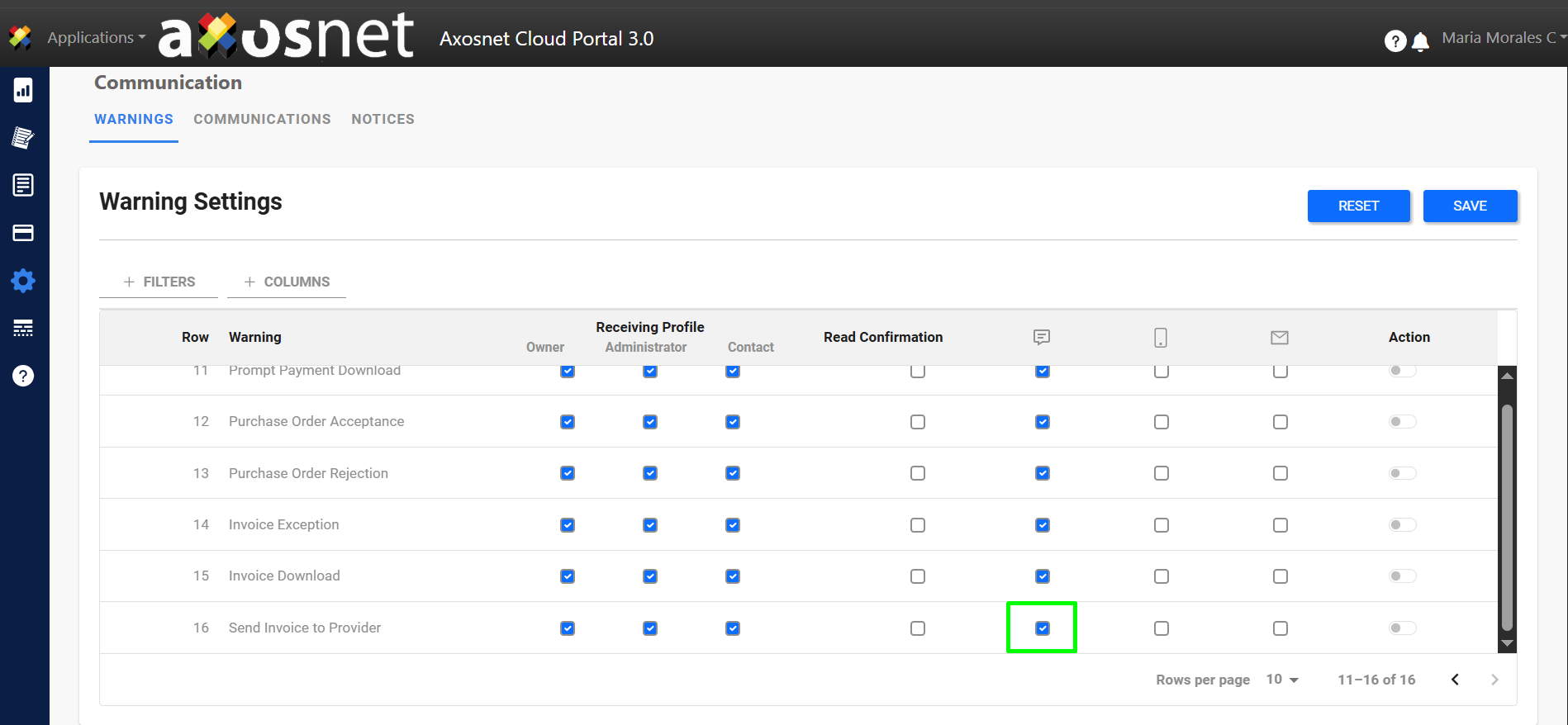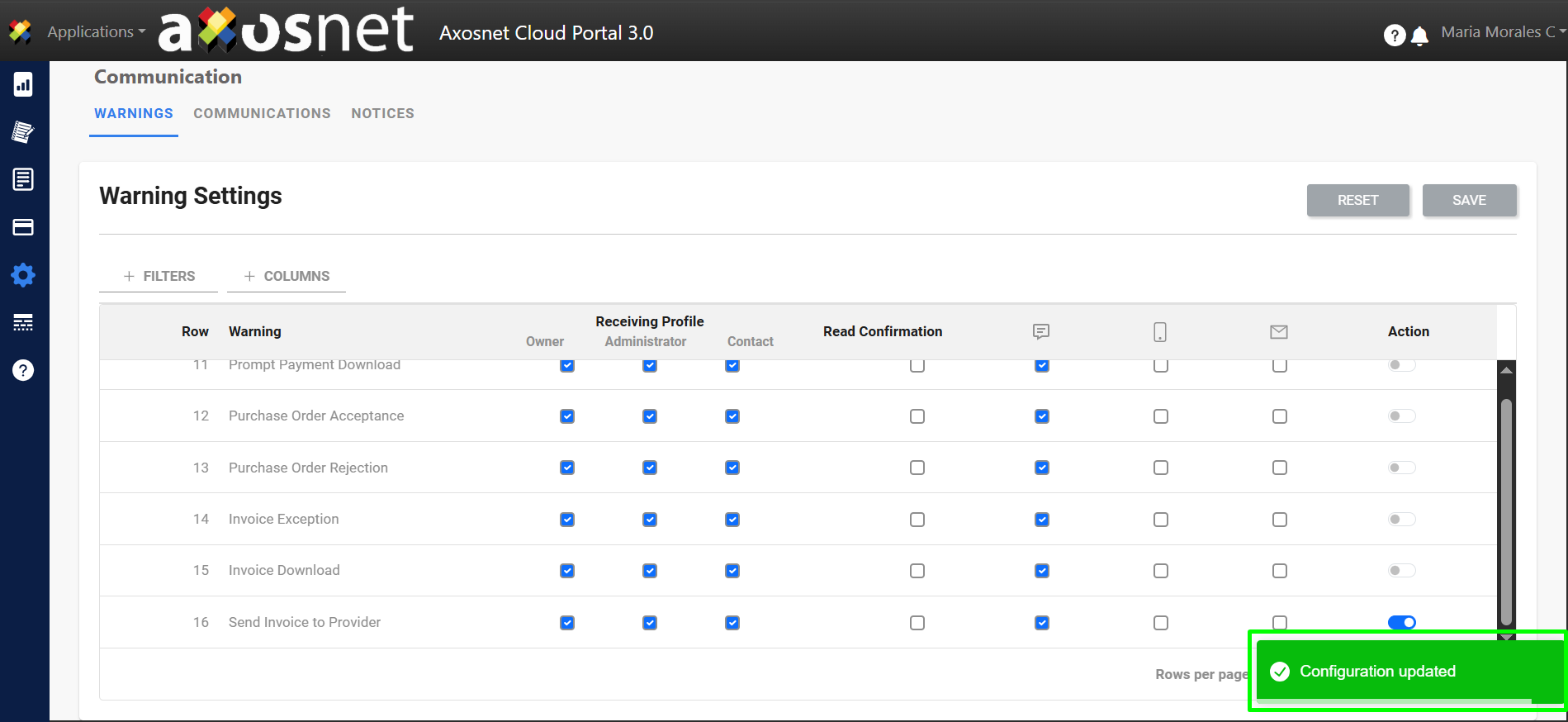 In this section you can configure the warnings predetermined by the system, these can be activated or deactivated and can be sent by web message (portal bell 🔔), app message or email (some options may not be available).